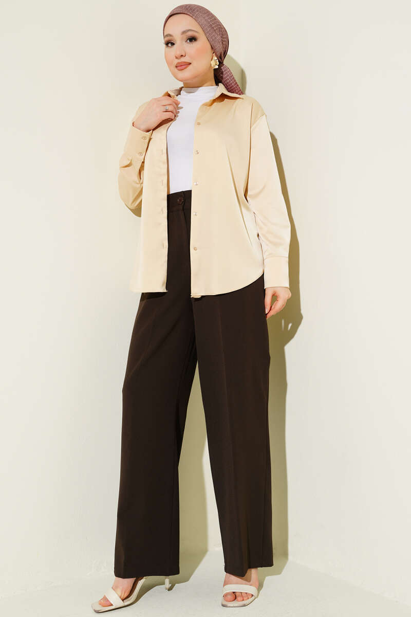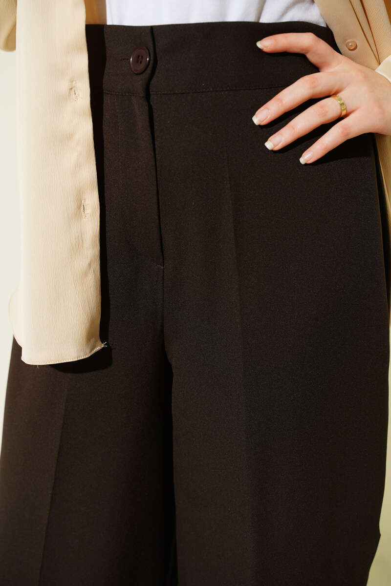 Modern ve Rahat Kesim: Geniş paça formu ve akışkan yapısı, yürürken zarif bir silüet oluşturur ve hareket özgürlüğünüzü maksimuma çıkarır.