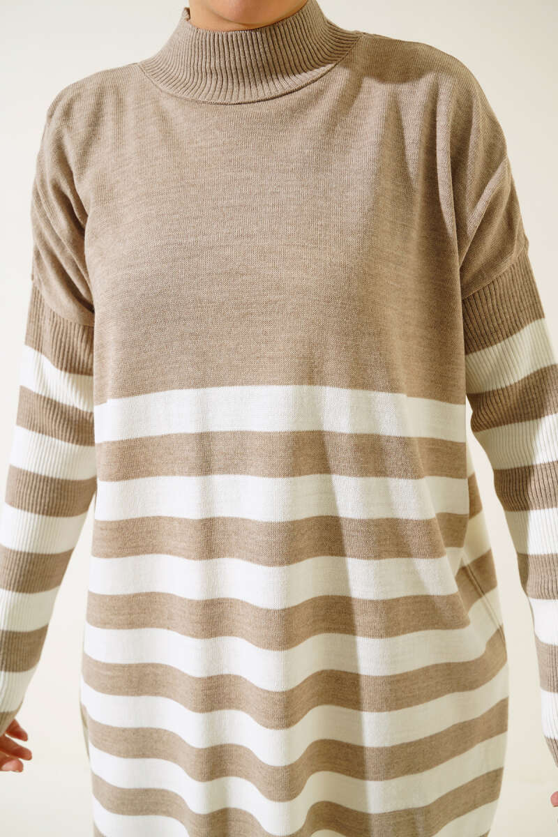 Yaka Fermuarlı Çizgili Triko Tunik Latte