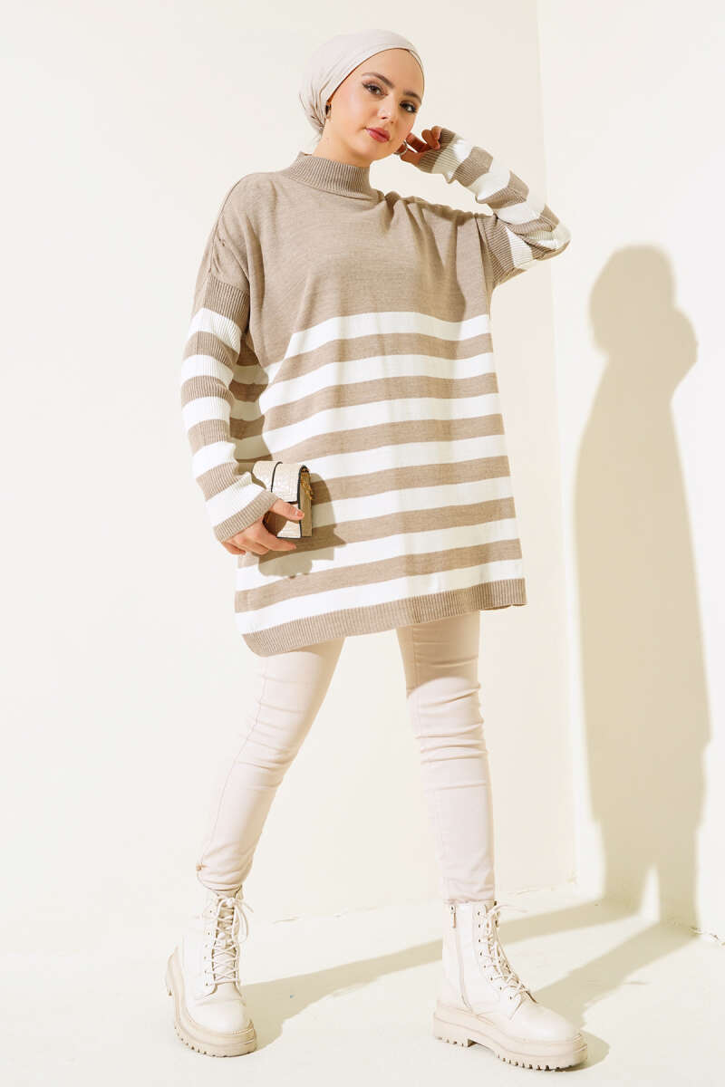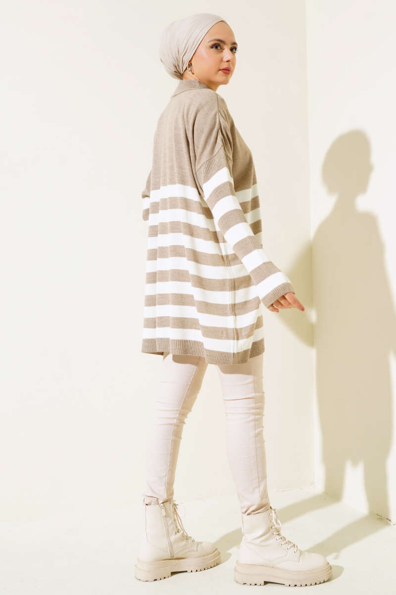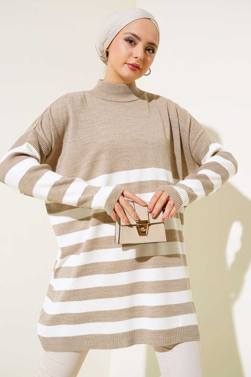 Yarım Boğazlı Çizgili Salaş Triko Tunik Vizon