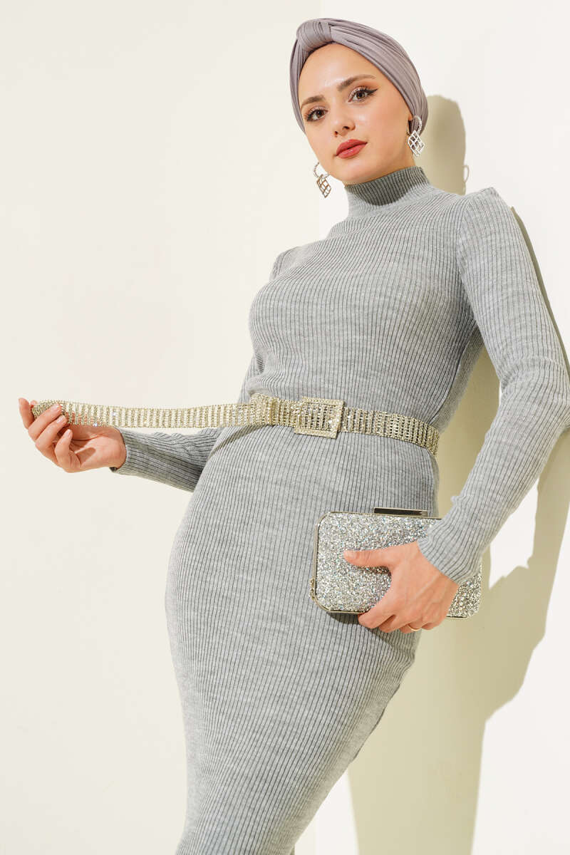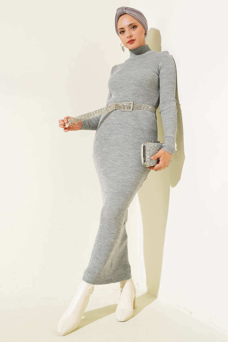 Şerit Ajur Desen Triko Elbise Zümrüt Yeşili