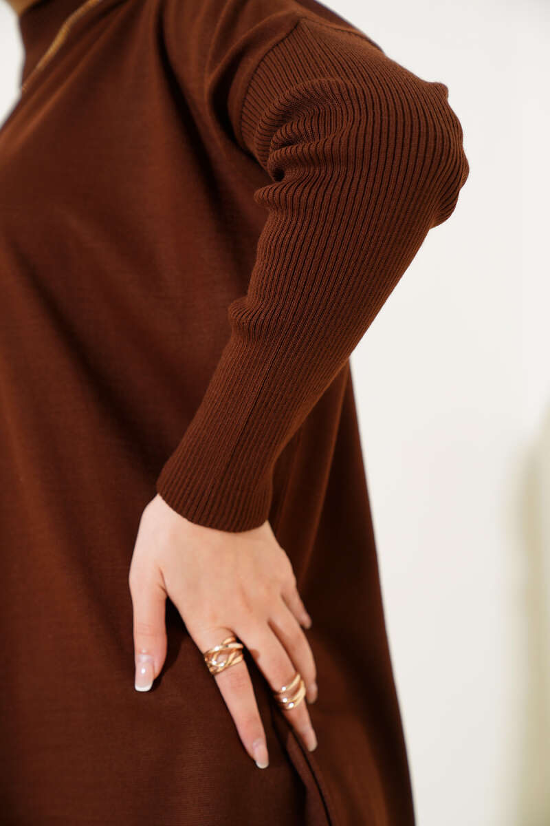 Saten Yaka Fularlı Triko Tunik Taba