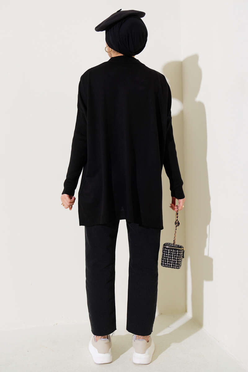 Örgü Kabartma Desenli Uzun Triko Hırka Siyah