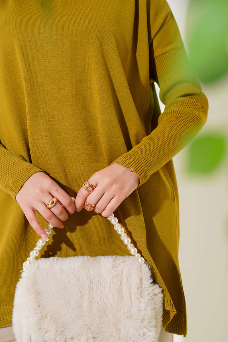 Kare Kabartmalı Yumoş Triko Tunik Yağ Yeşili
