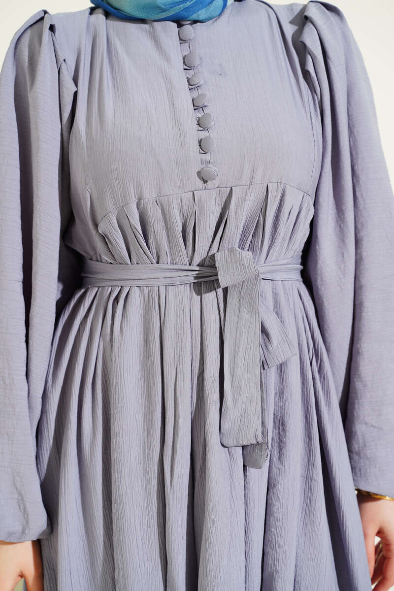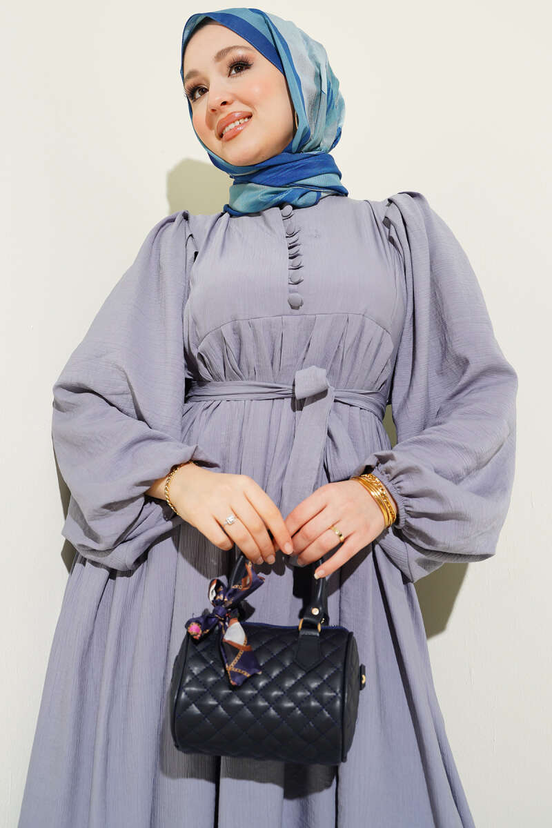 Yarım Brit Düğmeli Balon Kol Elbise Gri