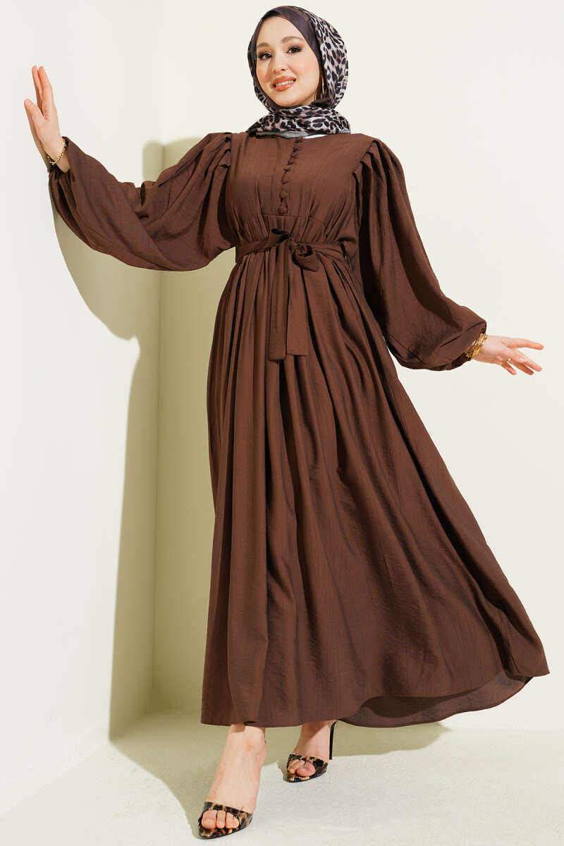Yarım Brit Düğmeli Balon Kol Elbise Kahve