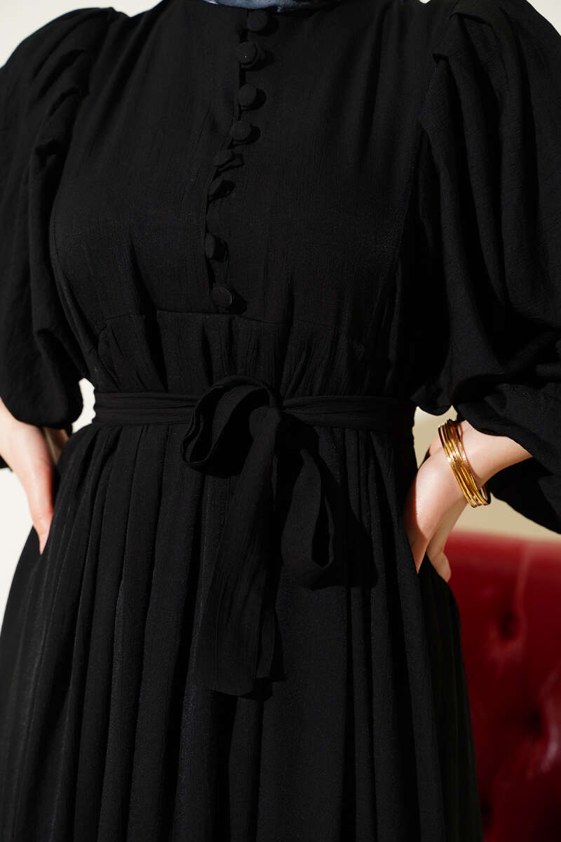 Yarım Brit Düğmeli Balon Kol Elbise Siyah