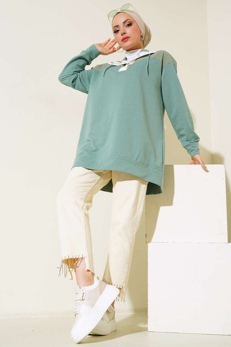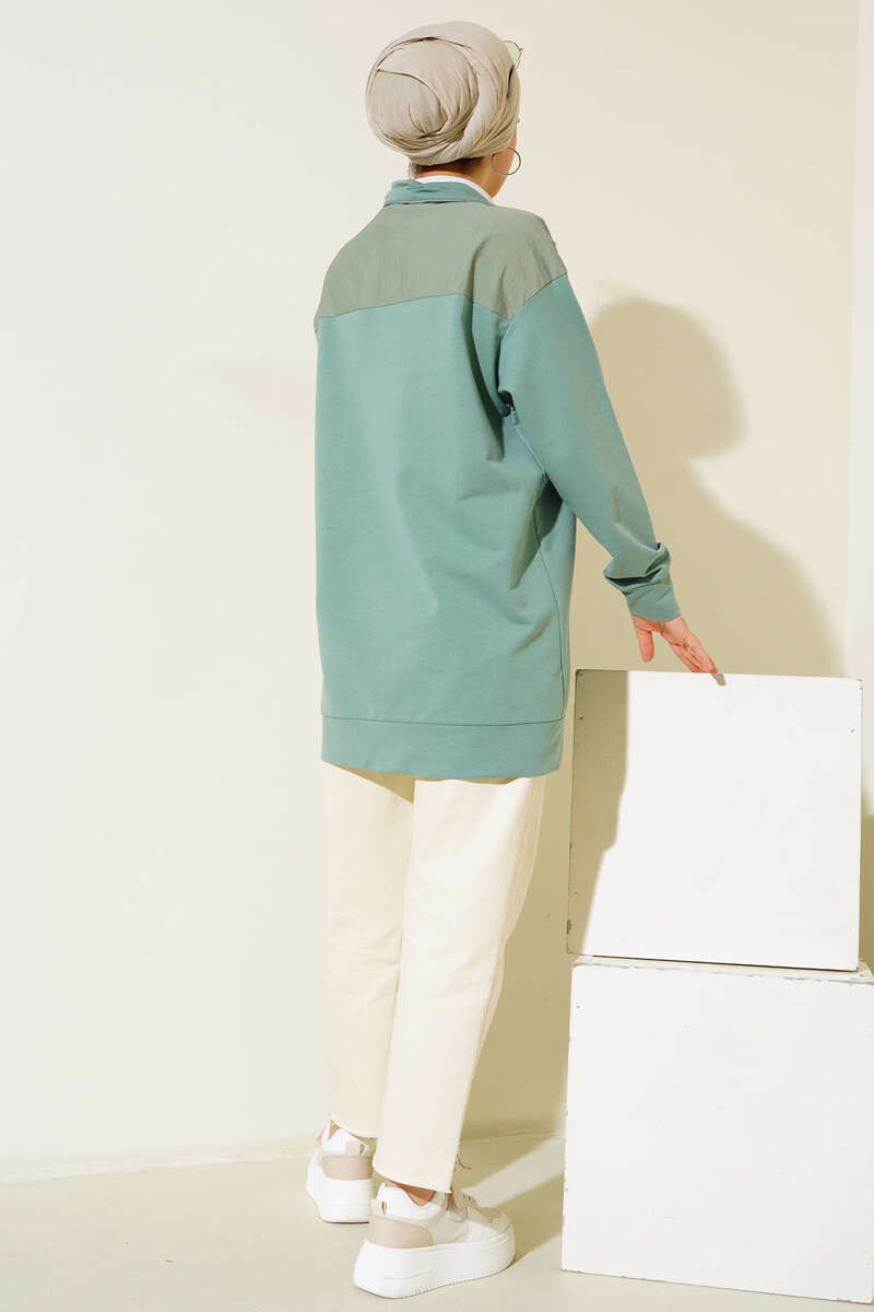 Renk kombinasyonları ile tasarlanan tuniğimizin yakası dik yakalıdır ayrıca yaka kısmında çıt çıt düğme detayları bulunmaktadır. Büzülebilir bağcık mevcuttur. Tuniğimizin omuz kısımları paraşüt kumaşa sahiptir.