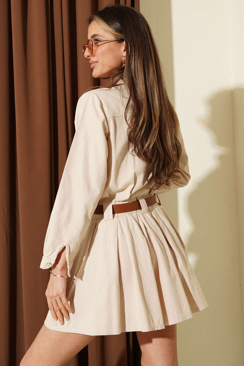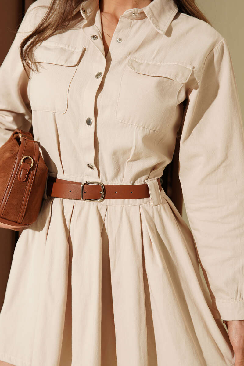 Yarım Çıtçıtlı Kemerli Pileli Mini Elbise Taş