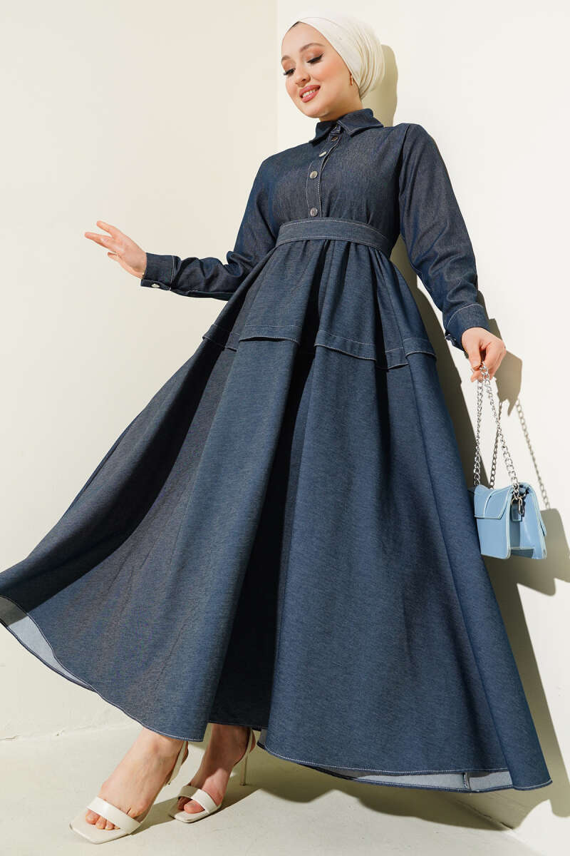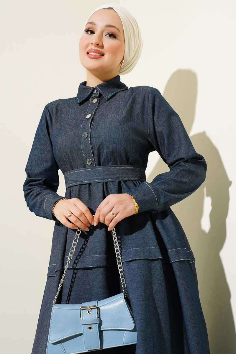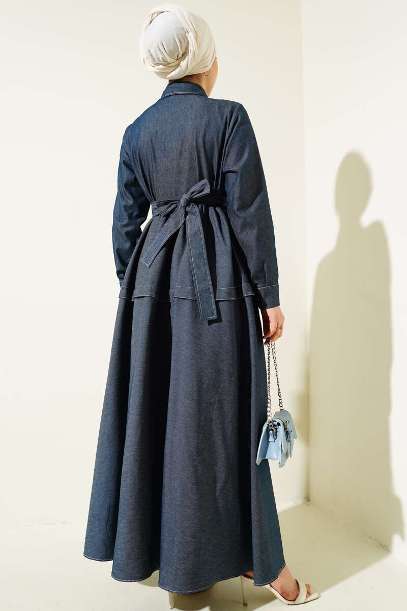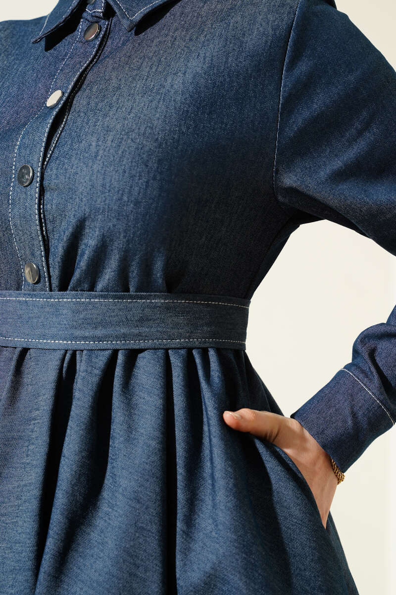 Kat Kat Kuşaklı Terikoton Elbise Lacivert