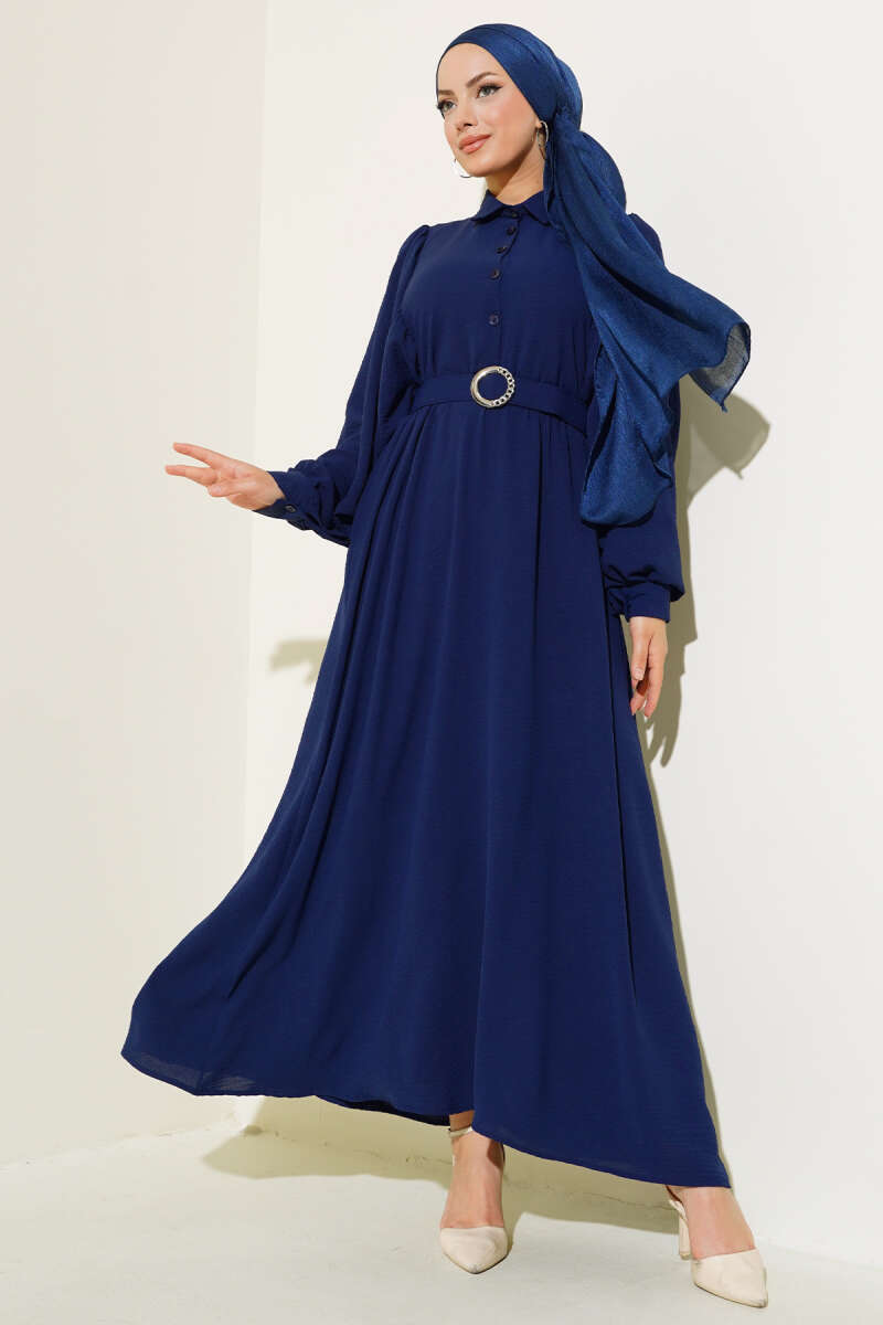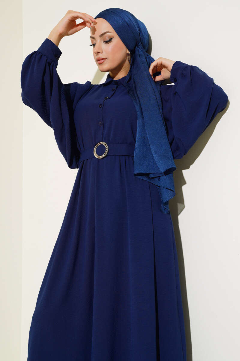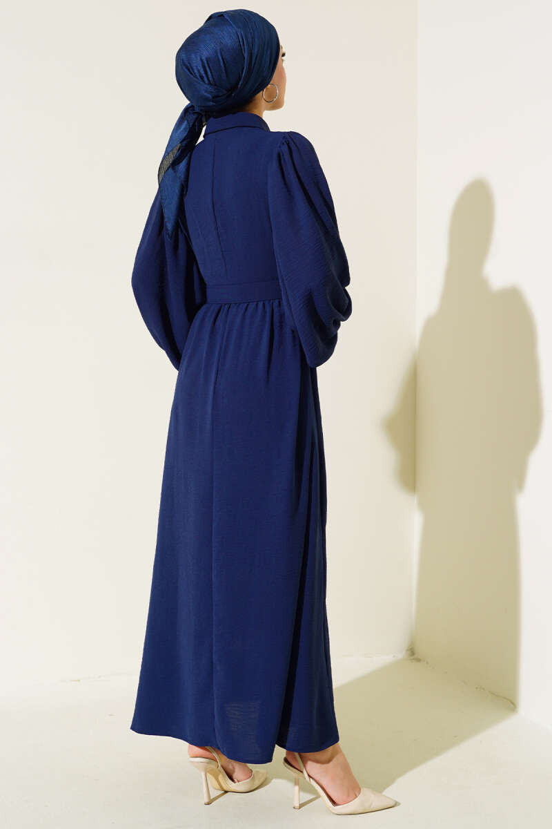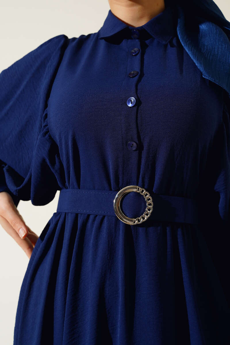 Yarım Düğmeli Balon Kol Kemerli Elbise Lacivert