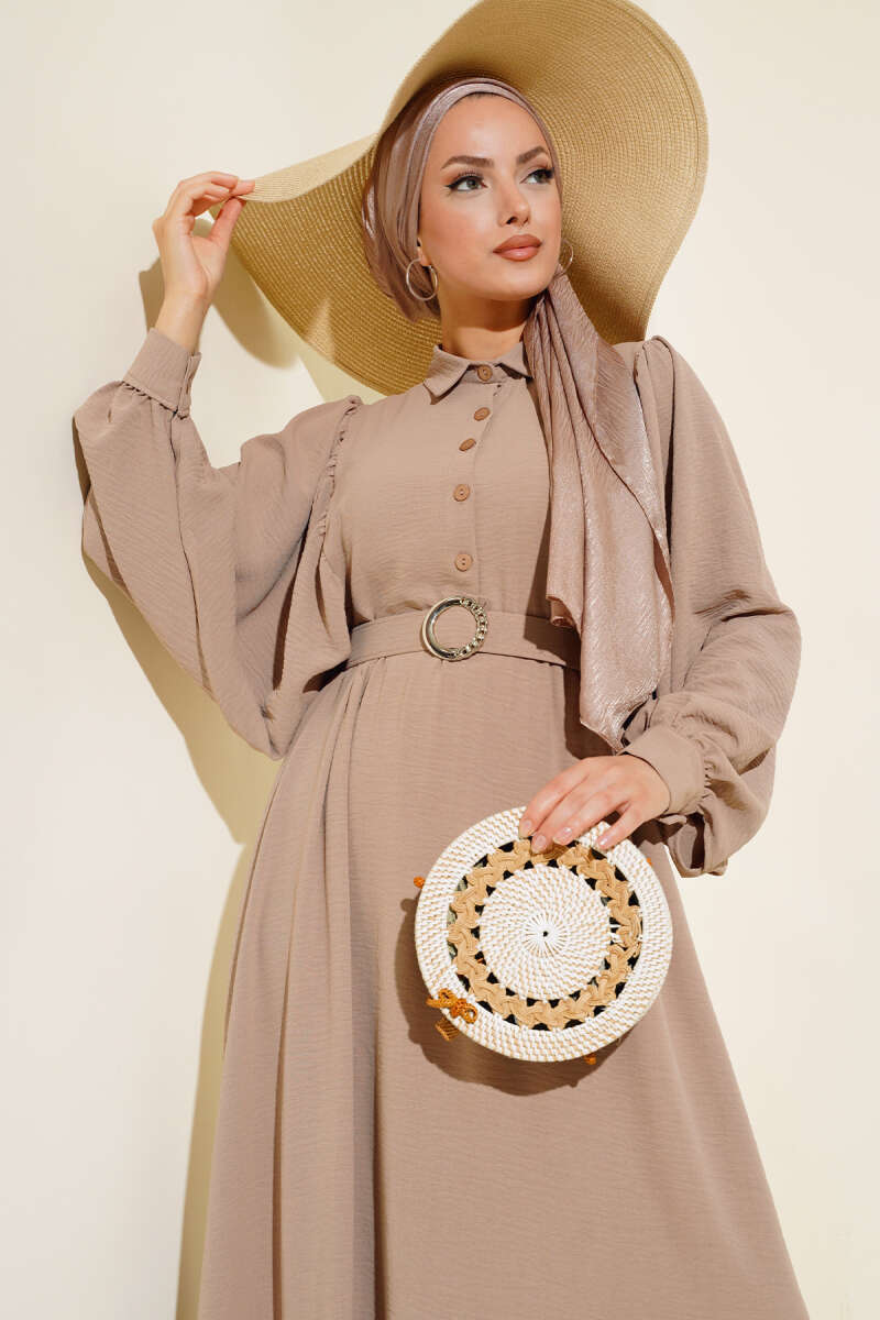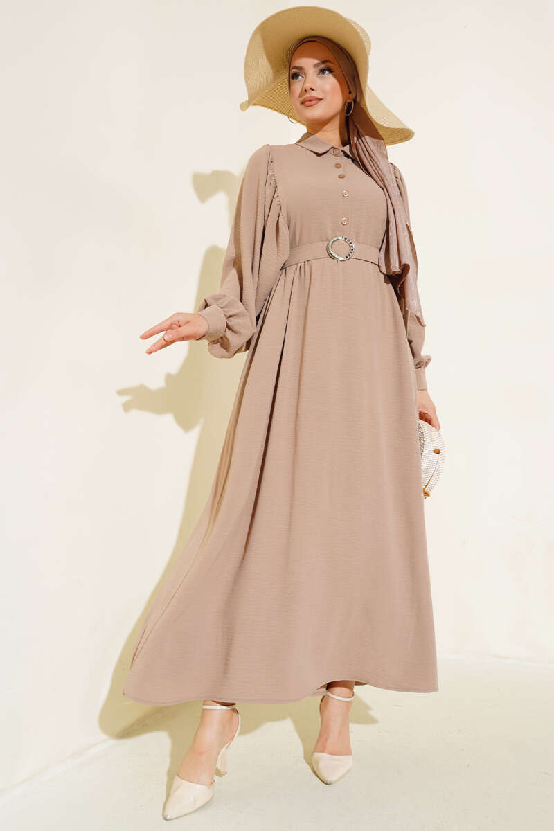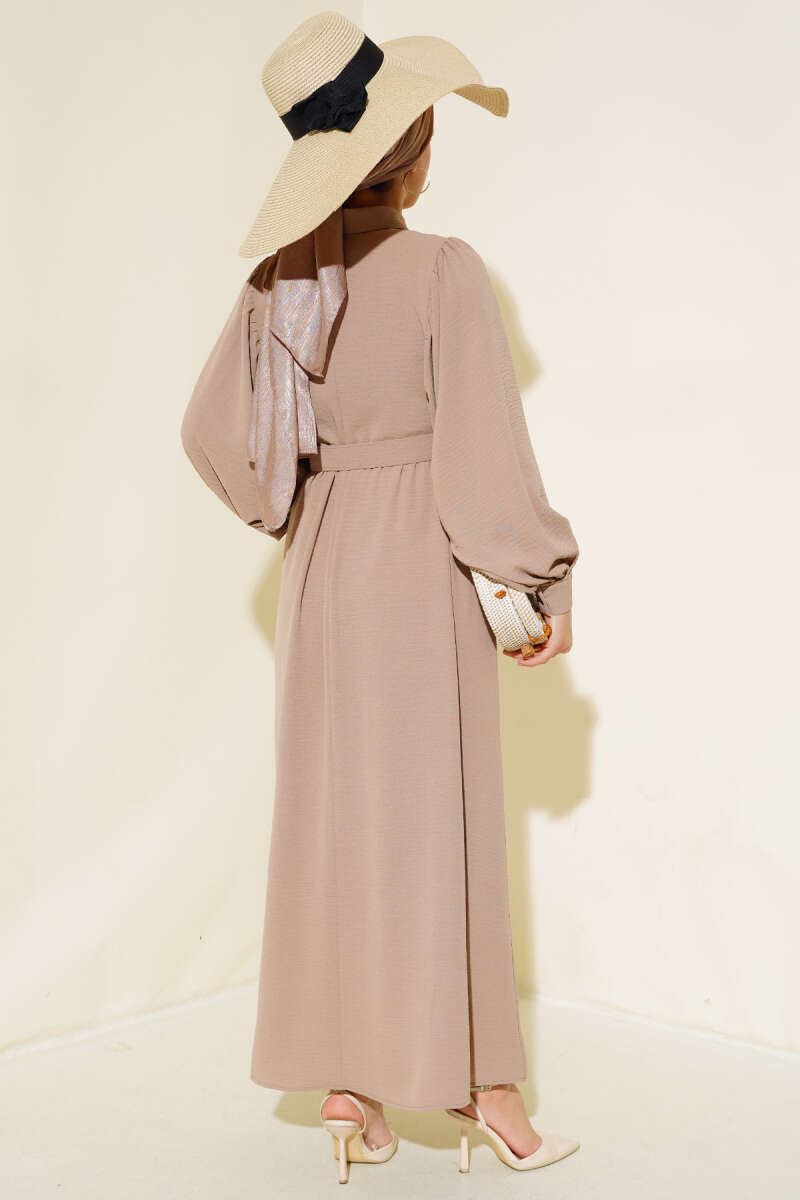Yarım Düğmeli Balon Kol Kemerli Elbise Latte