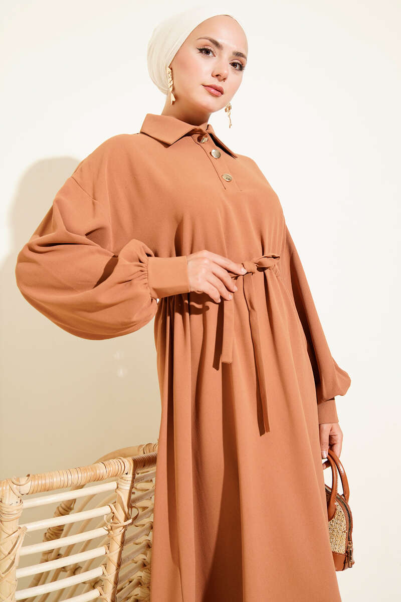 Yarım Düğmeli Beli Tünelli Elbise Taba