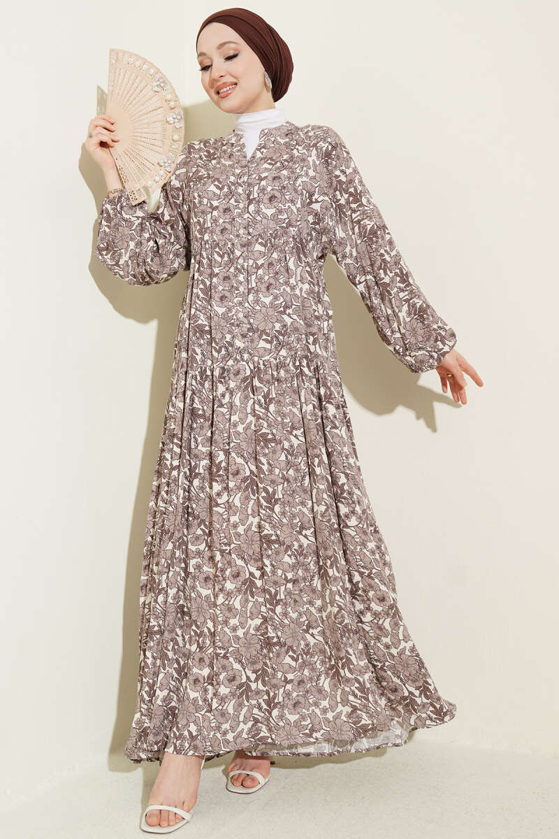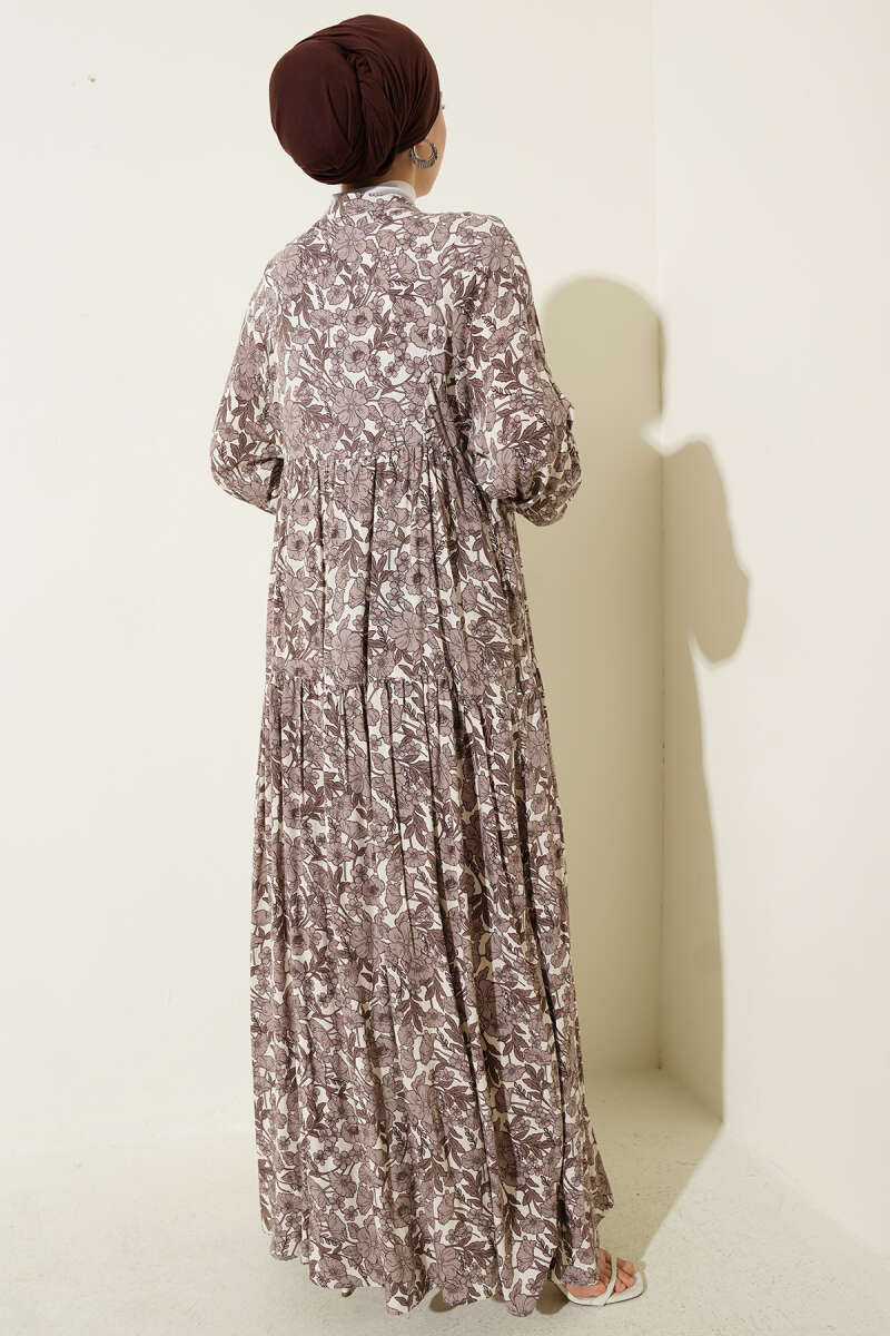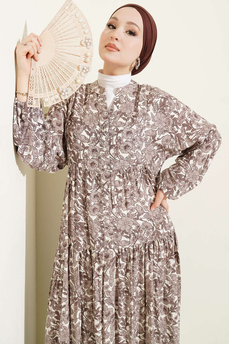 Yarım Düğmeli Çiçek Desenli Katlı Elbise Kahve