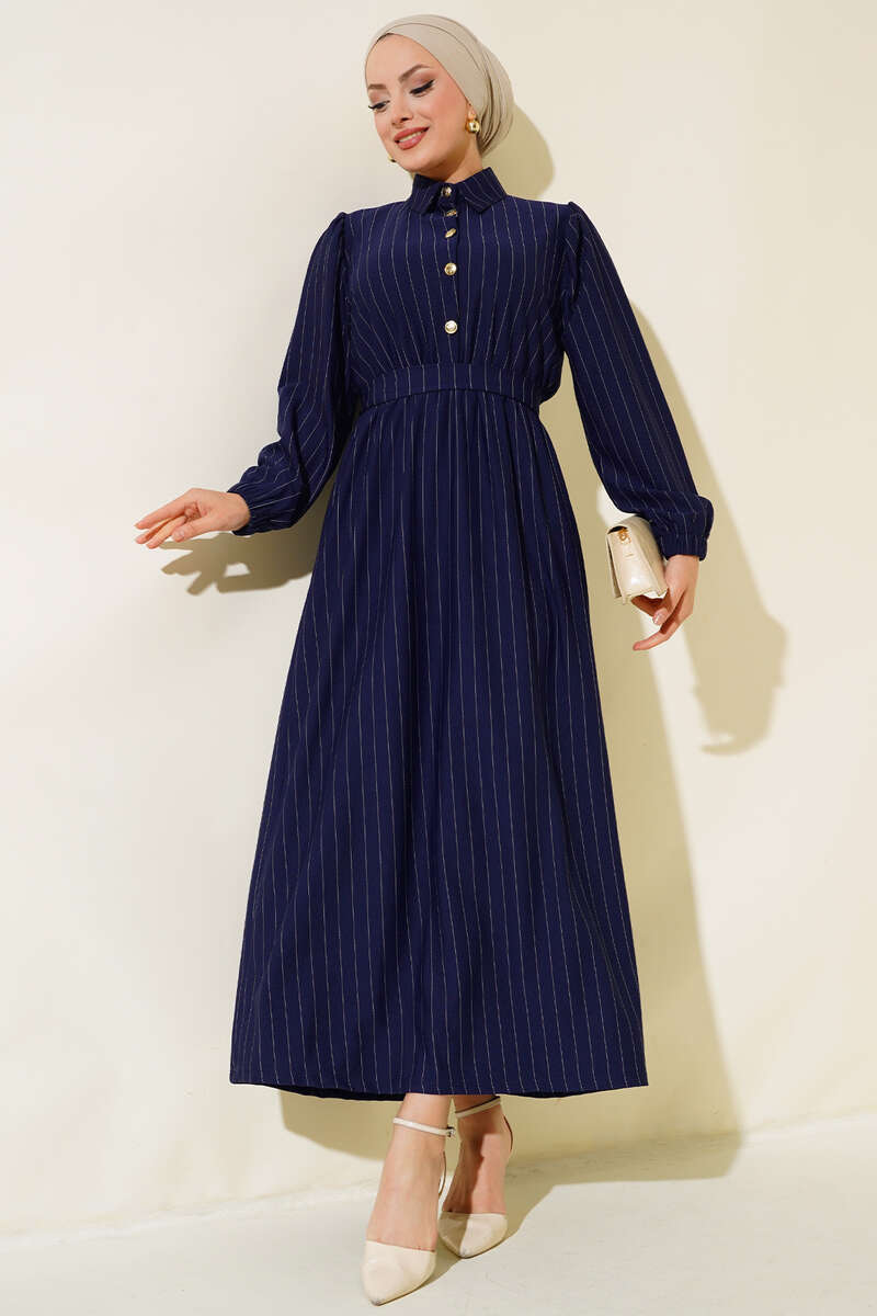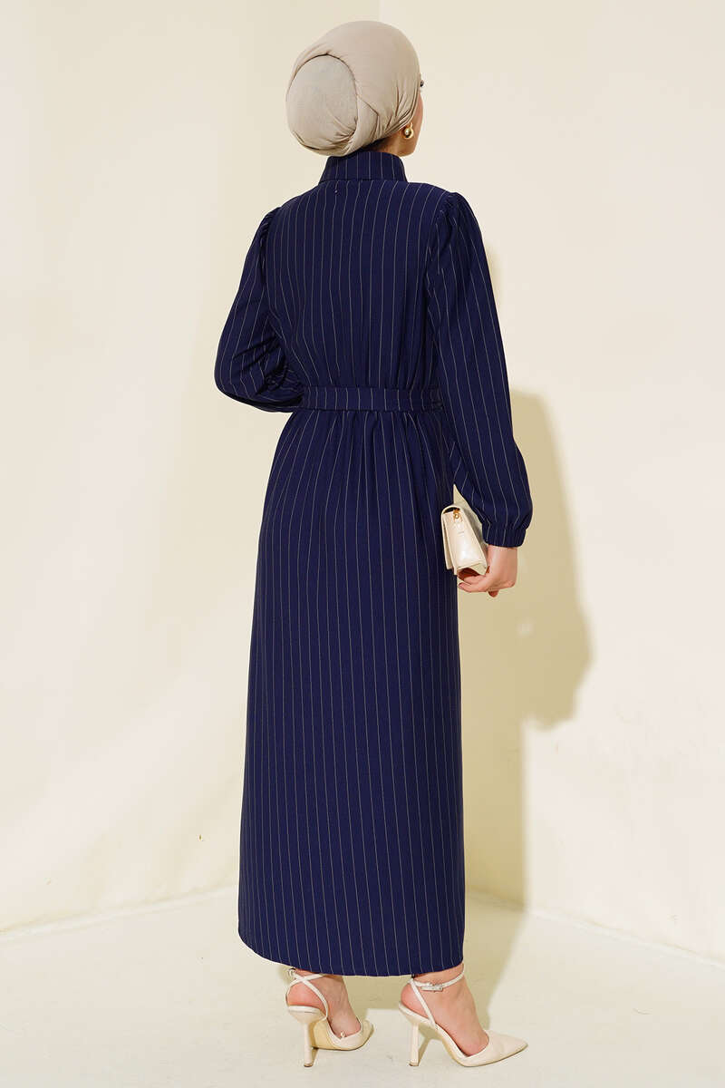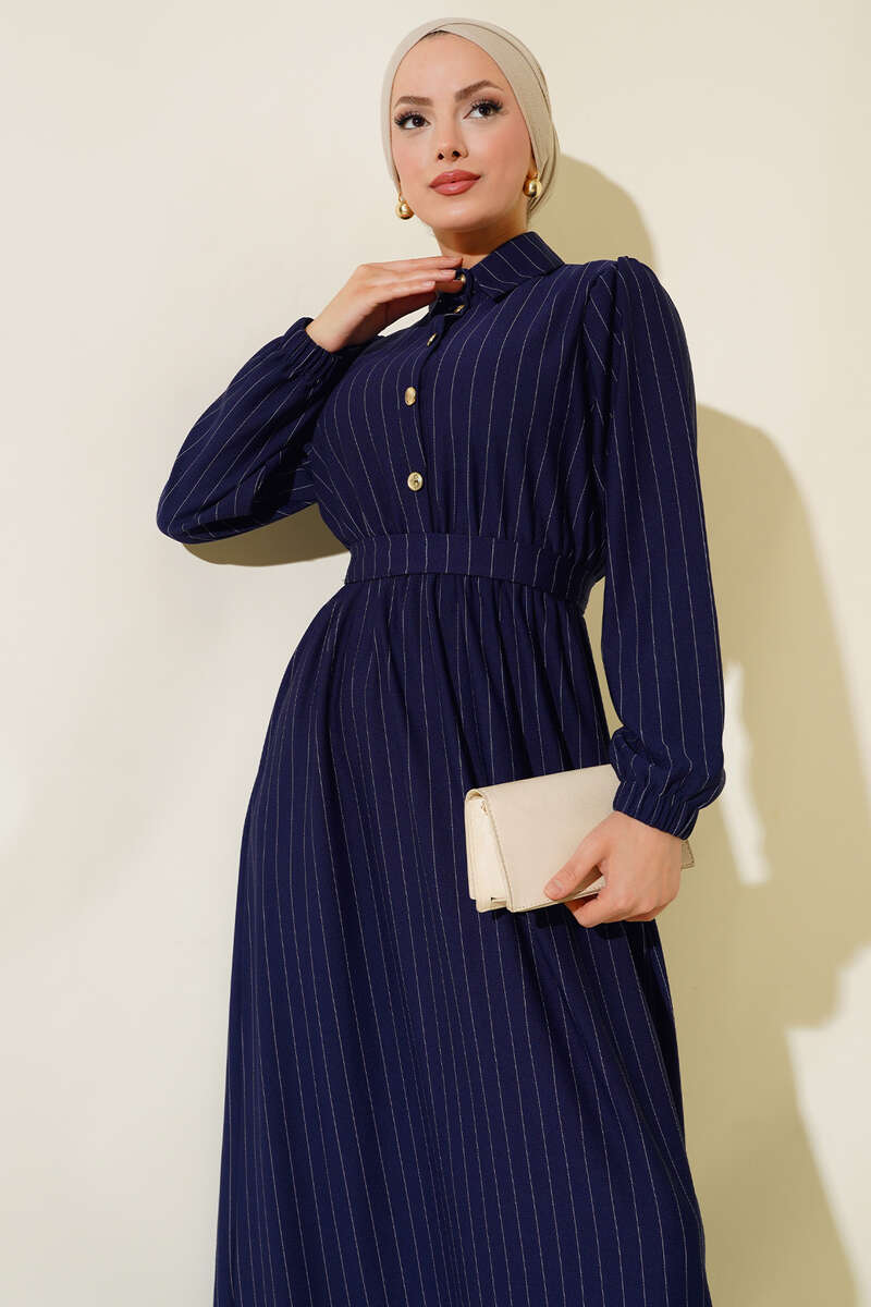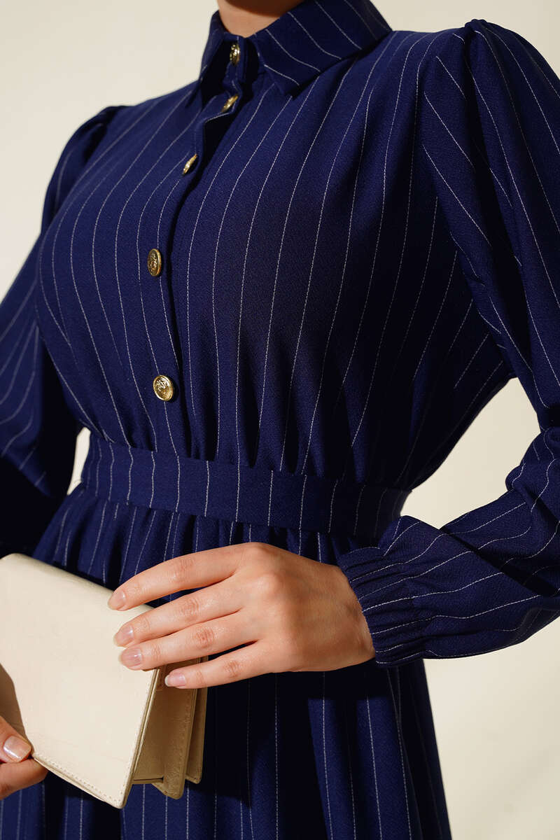 Yarım Düğmeli Çizgili Elbise Lacivert