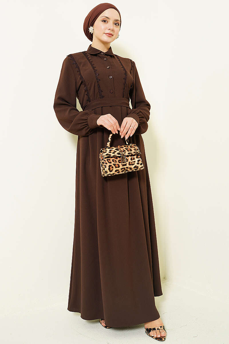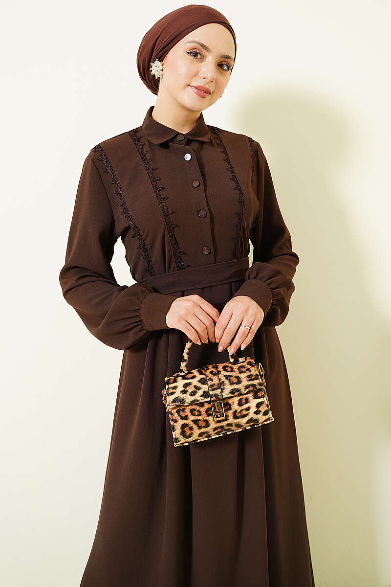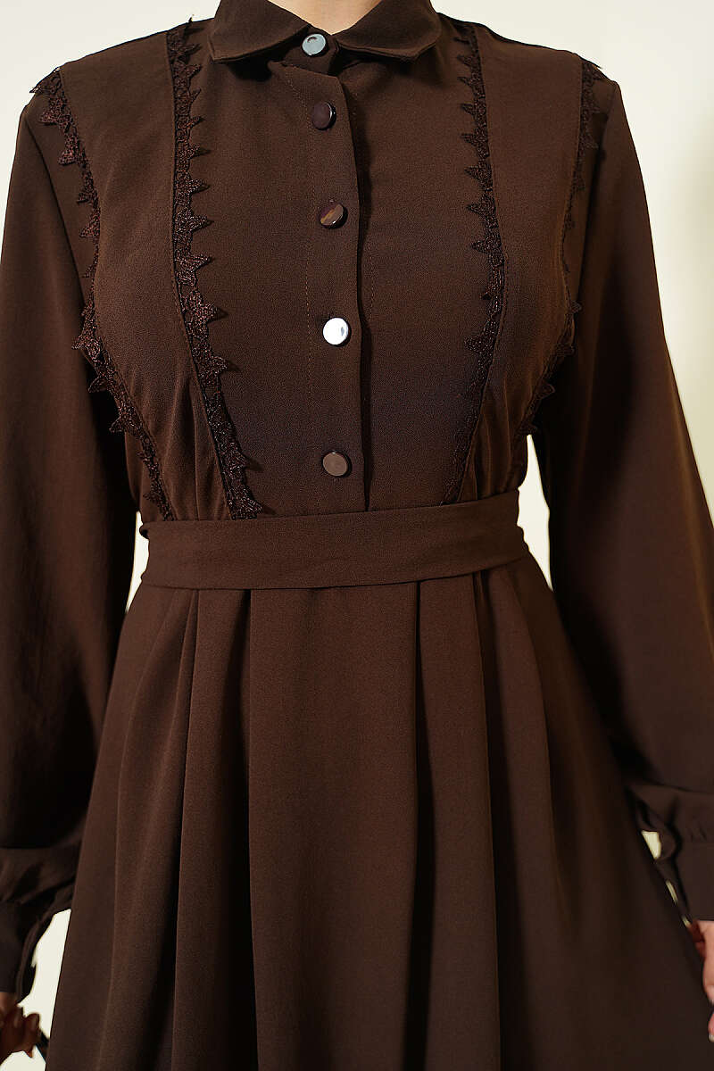 Yarım Düğmeli Dantel Detaylı Elbise Kahve
