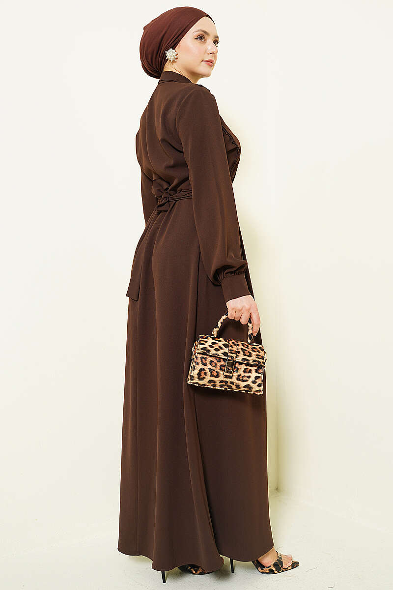 Brit Düğmeli Dantelli Abiye Elbise Kahve