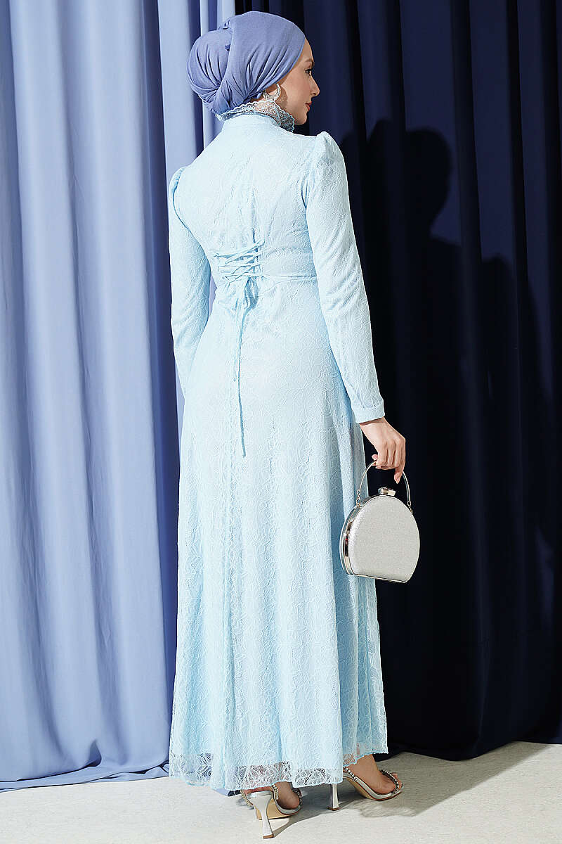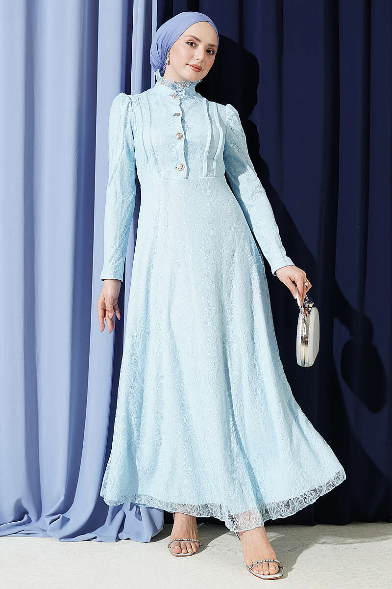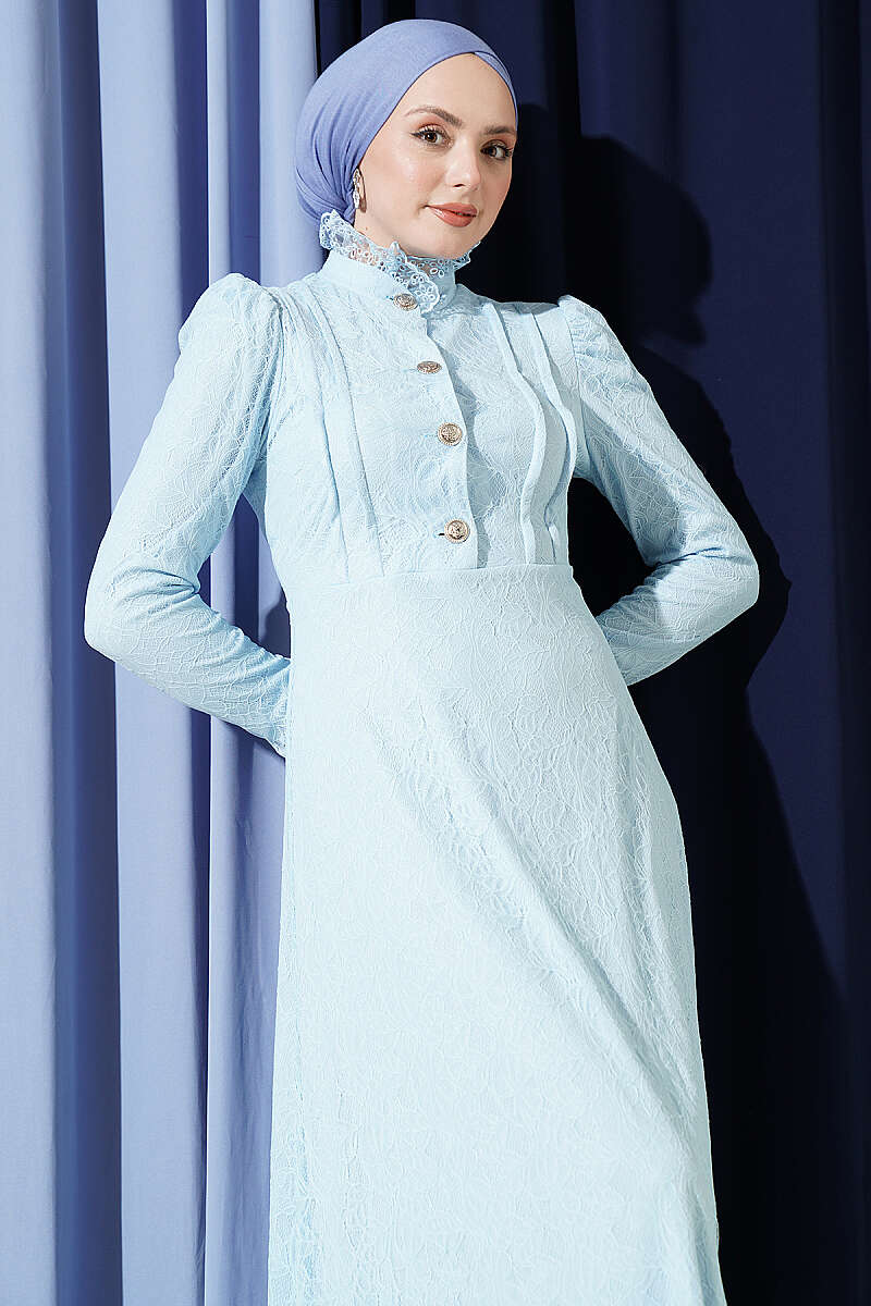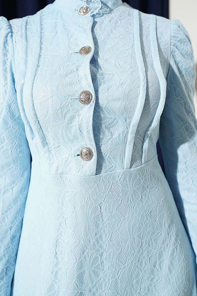 Yarım Düğmeli Dantelli Abiye Elbise Bebe Mavi