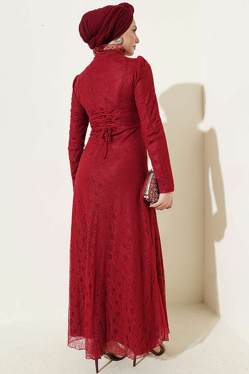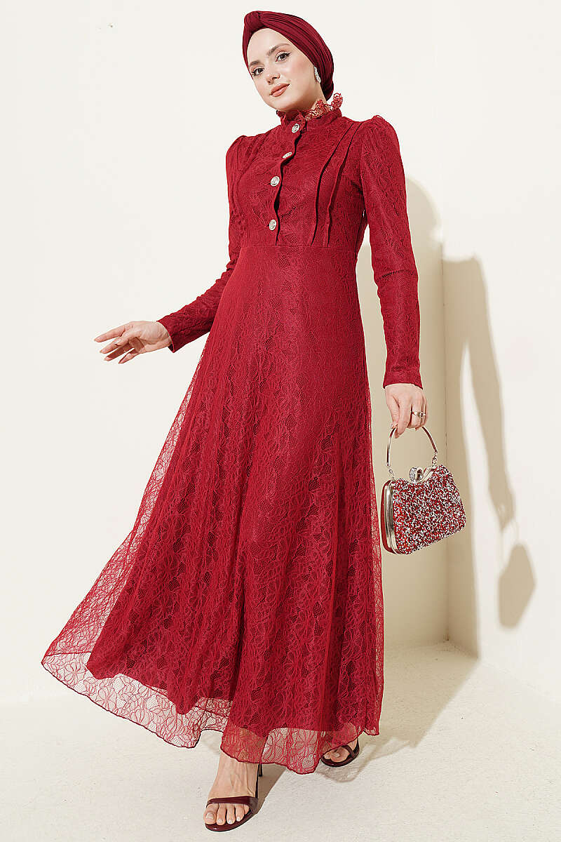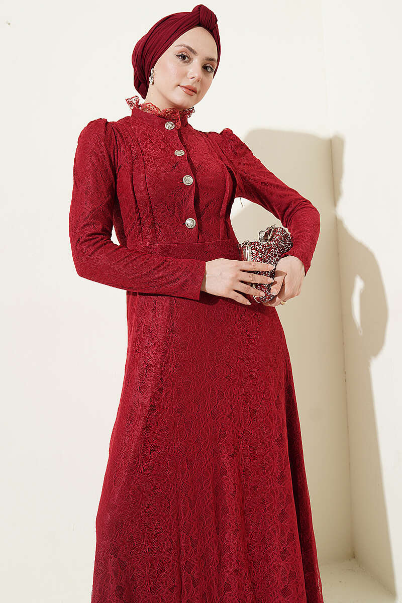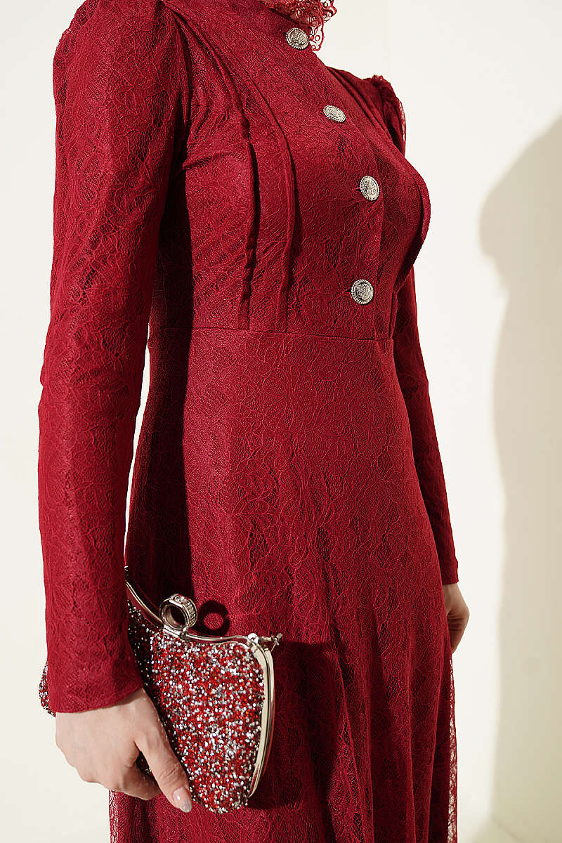 Yarım Düğmeli Dantelli Abiye Elbise Bordo