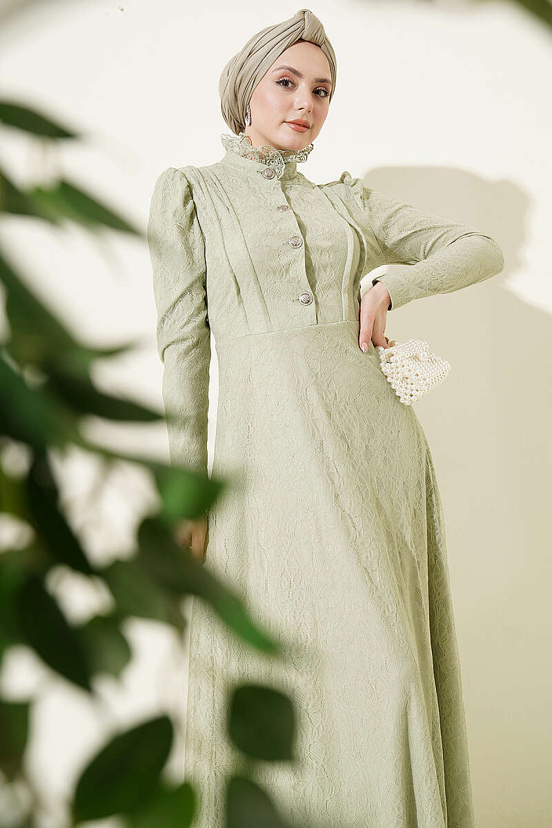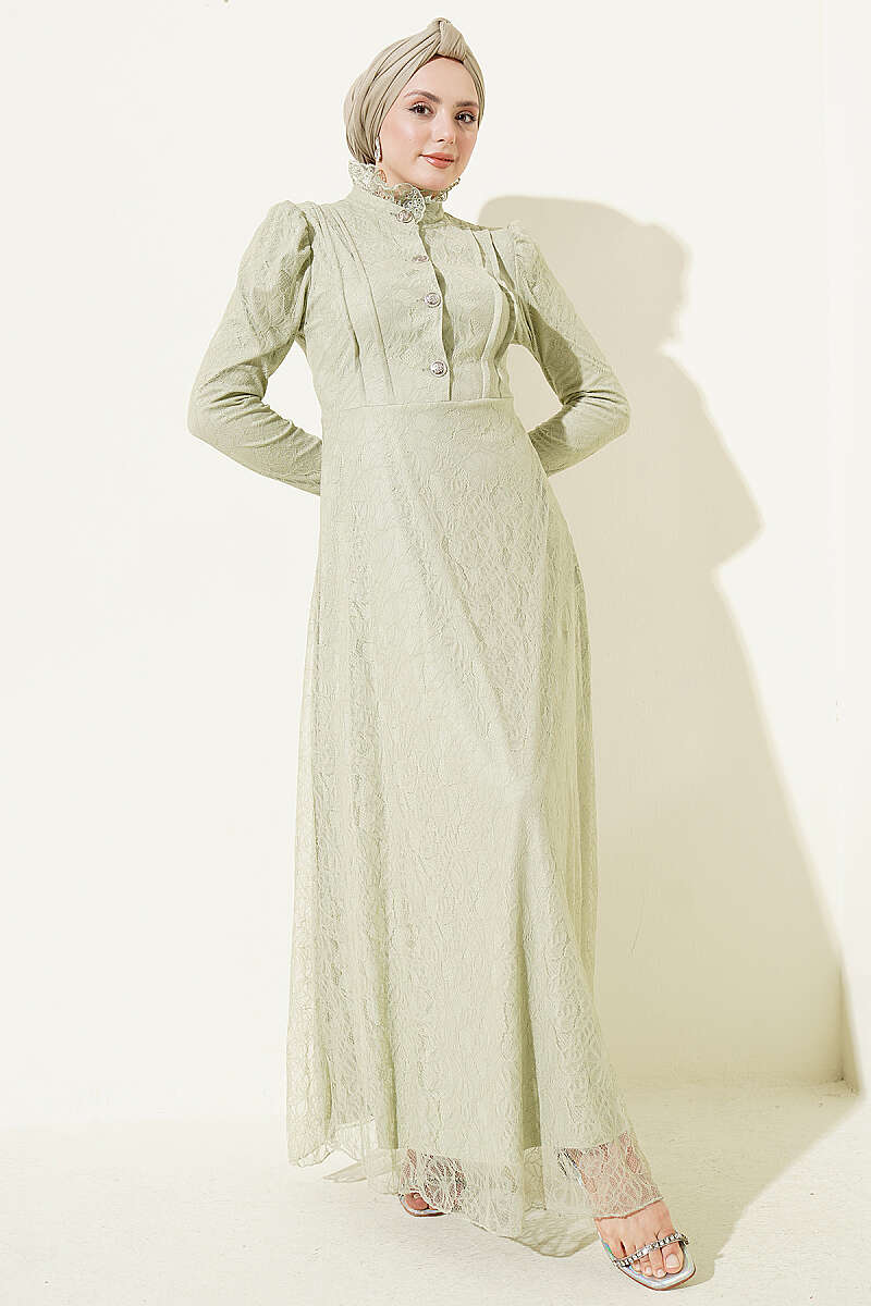 Yarım Düğmeli Dantelli Abiye Elbise Çağla Yeşili