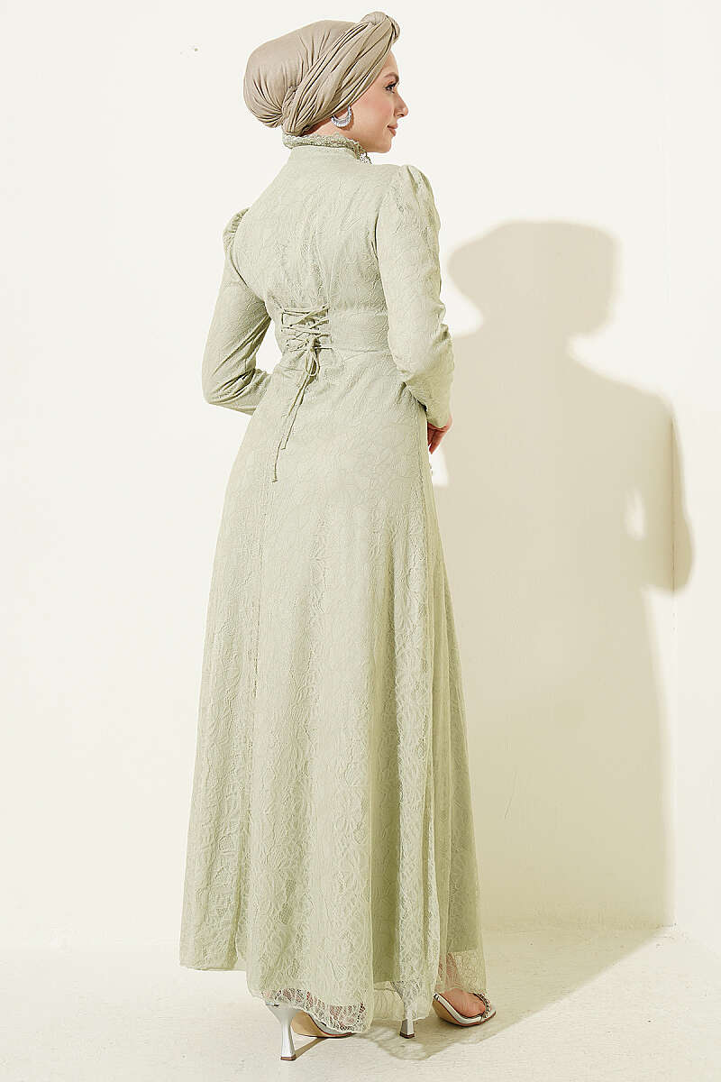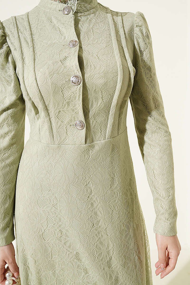 Yarım Düğmeli Dantelli Abiye Elbise Haki