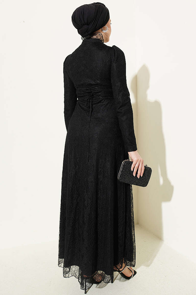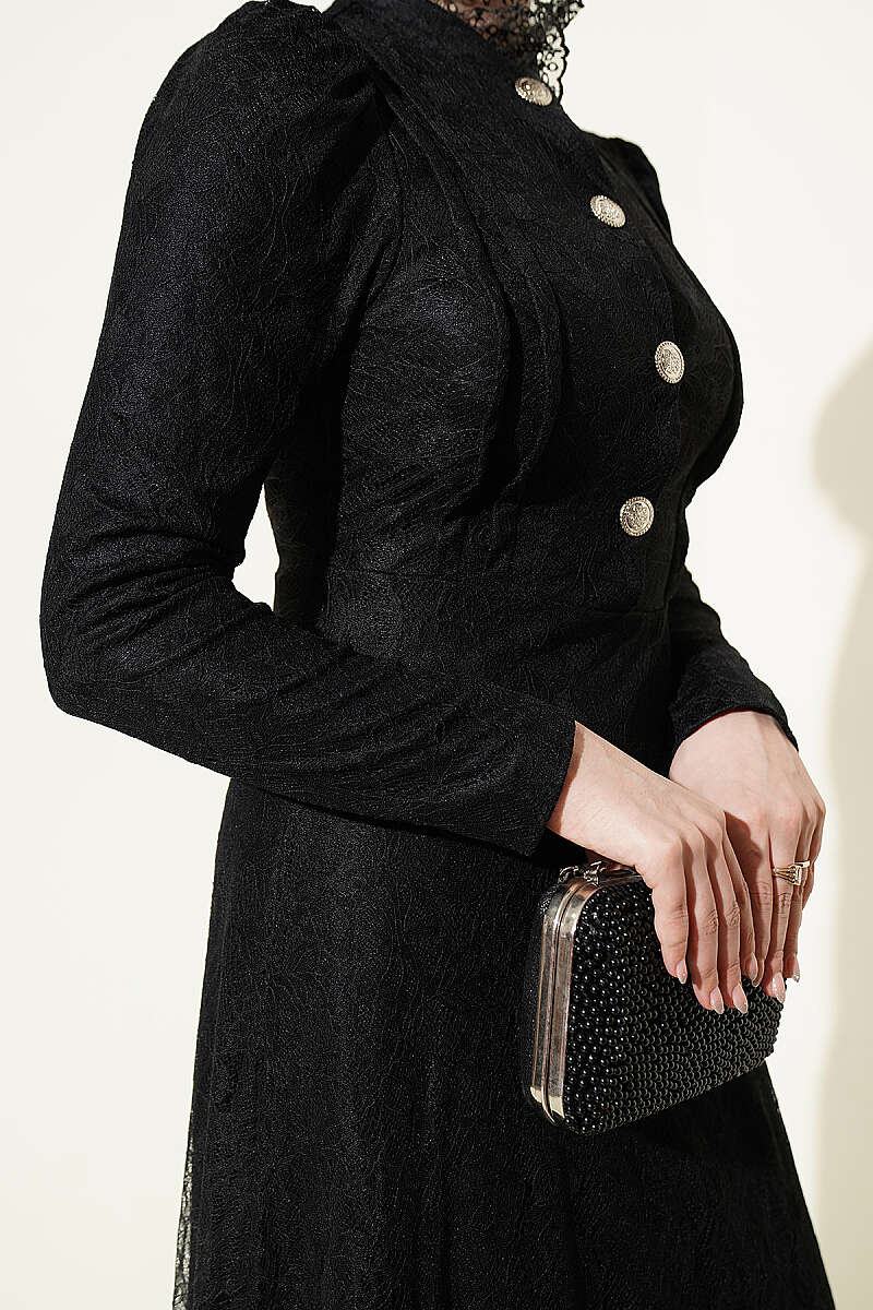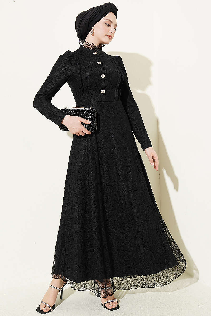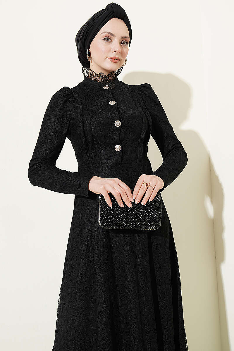 Yarım Düğmeli Dantelli Abiye Elbise Siyah