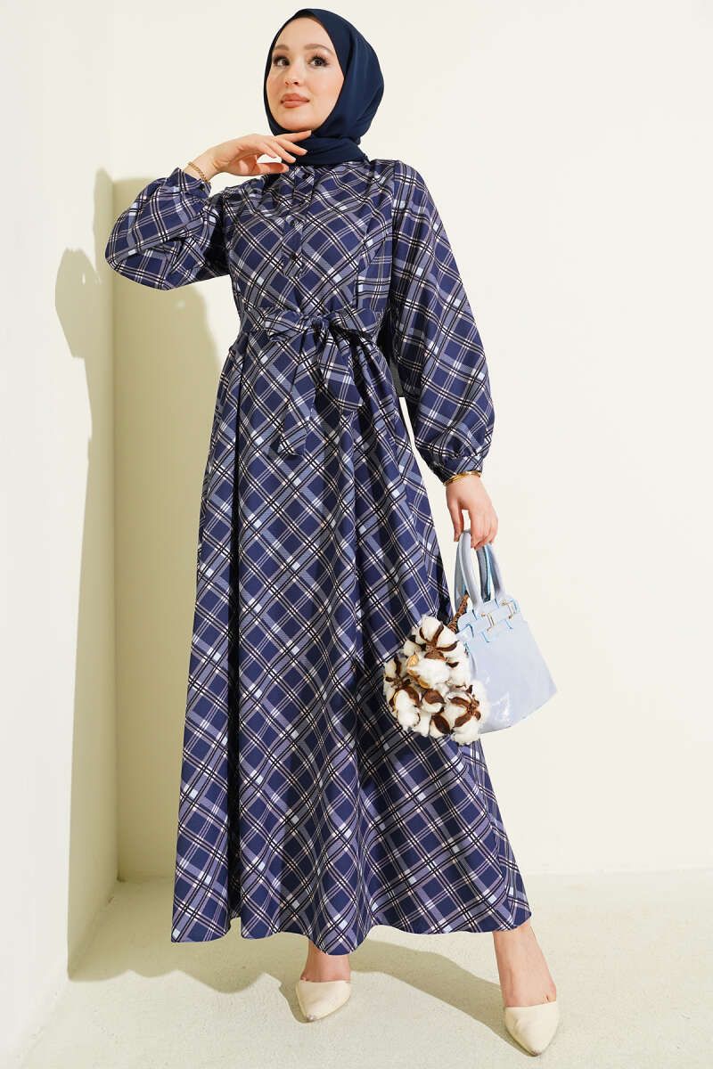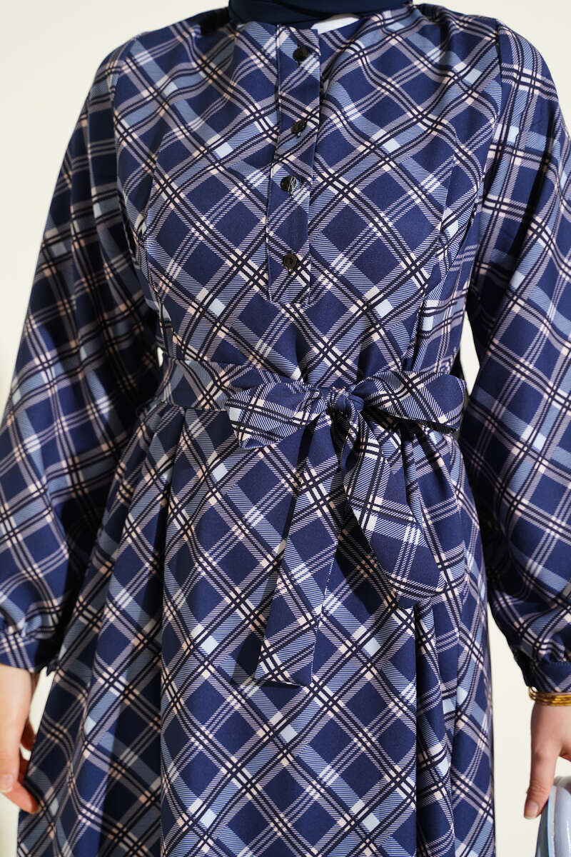 Yarım Düğmeli Ekoseli Kloş Elbise Lacivert