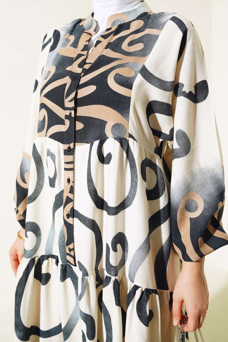 Yarım Düğmeli Etnik Desen Kat Elbise Mor