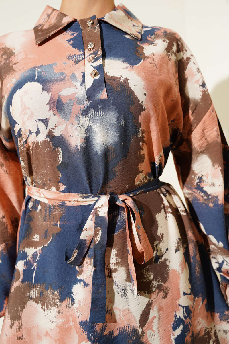 Yarım Düğmeli Balon Kol Kemerli Elbise Bej