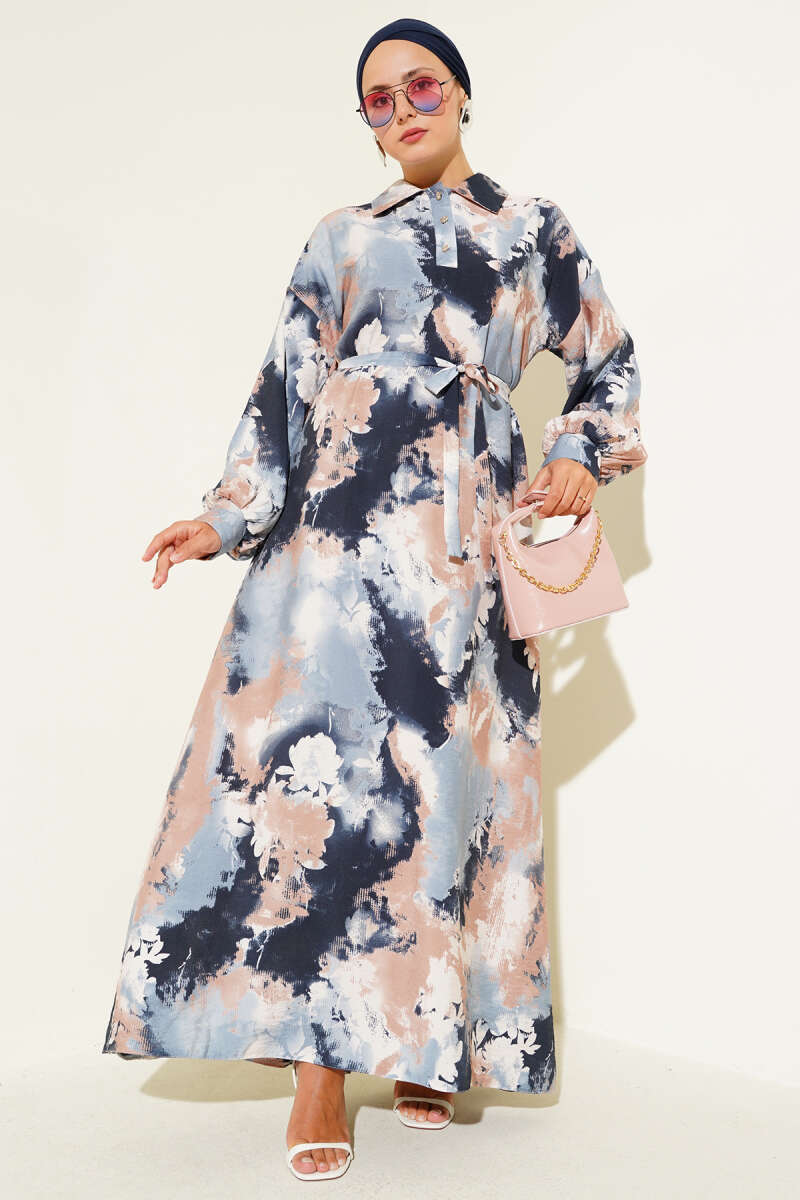 Paisley Desen Bel Lastikli Elbise Lacivert