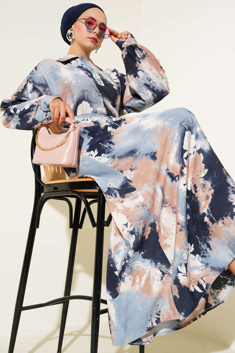 Etnik Desen Düğmeli Salaş Elbise Lacivert