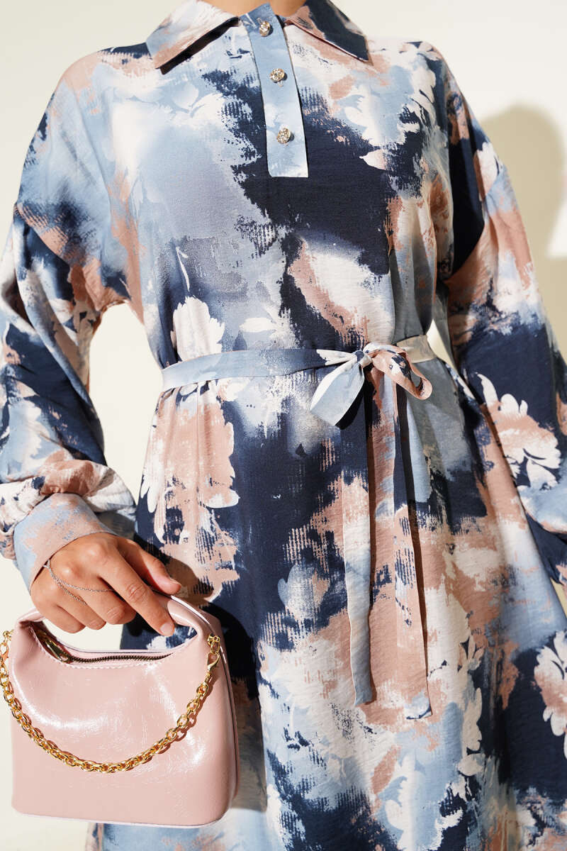 Boydan Düğmeli Kemerli Tensel Elbise İndigo