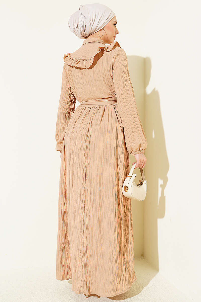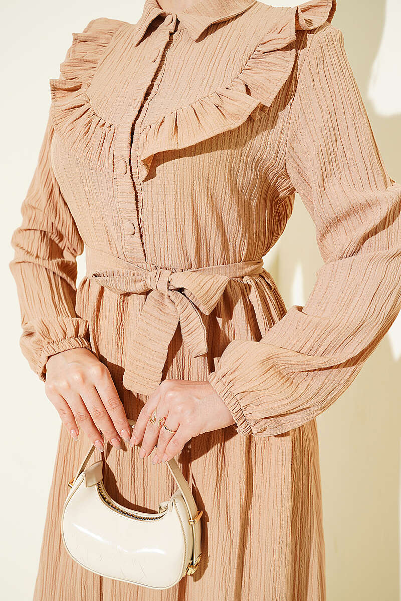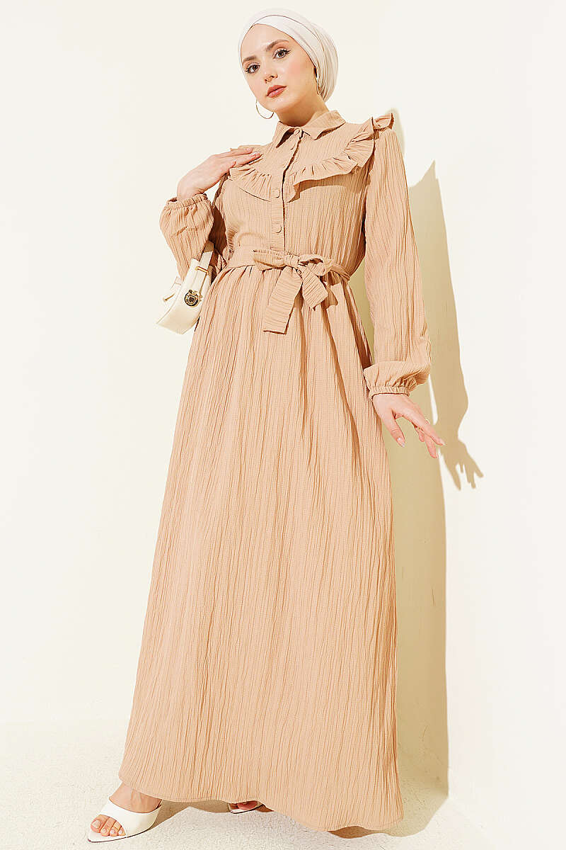 Yarım Düğmeli Fırfırlı Krinkıl Elbise Bej