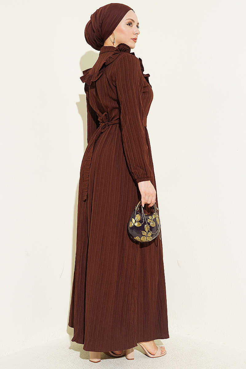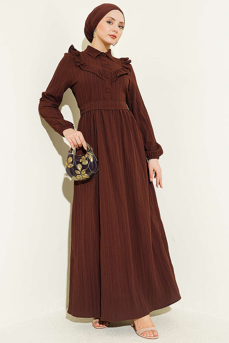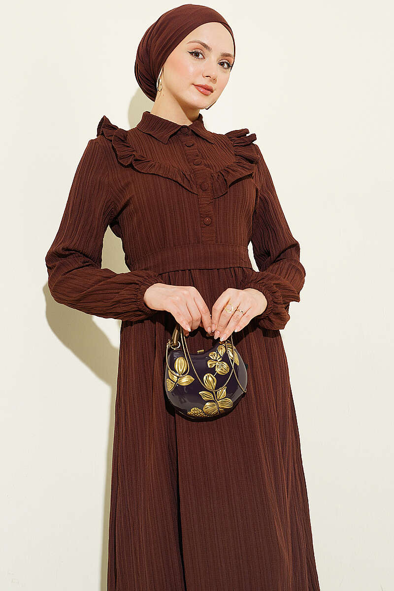 Yarım Düğmeli Fırfırlı Krinkıl Elbise Kahve