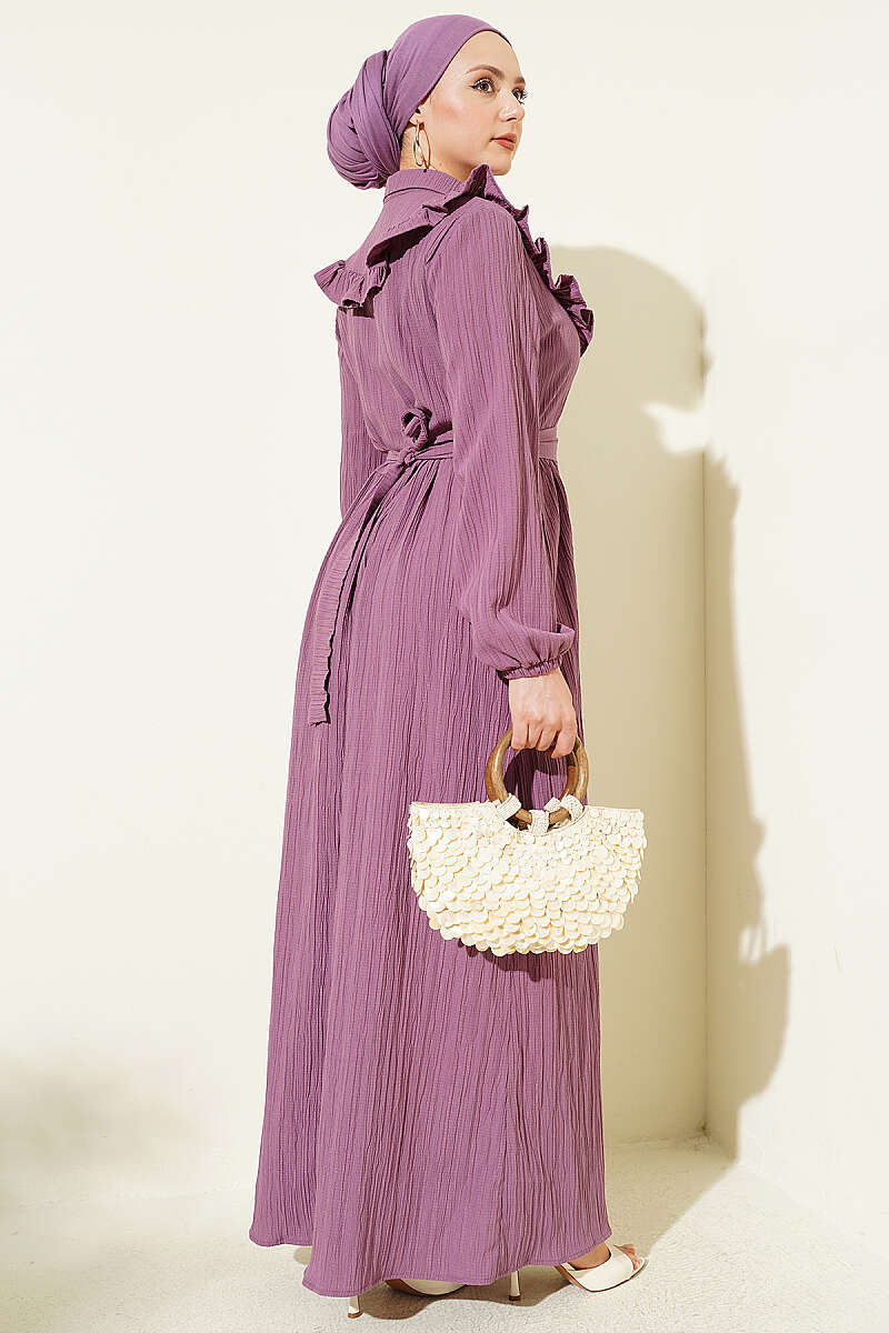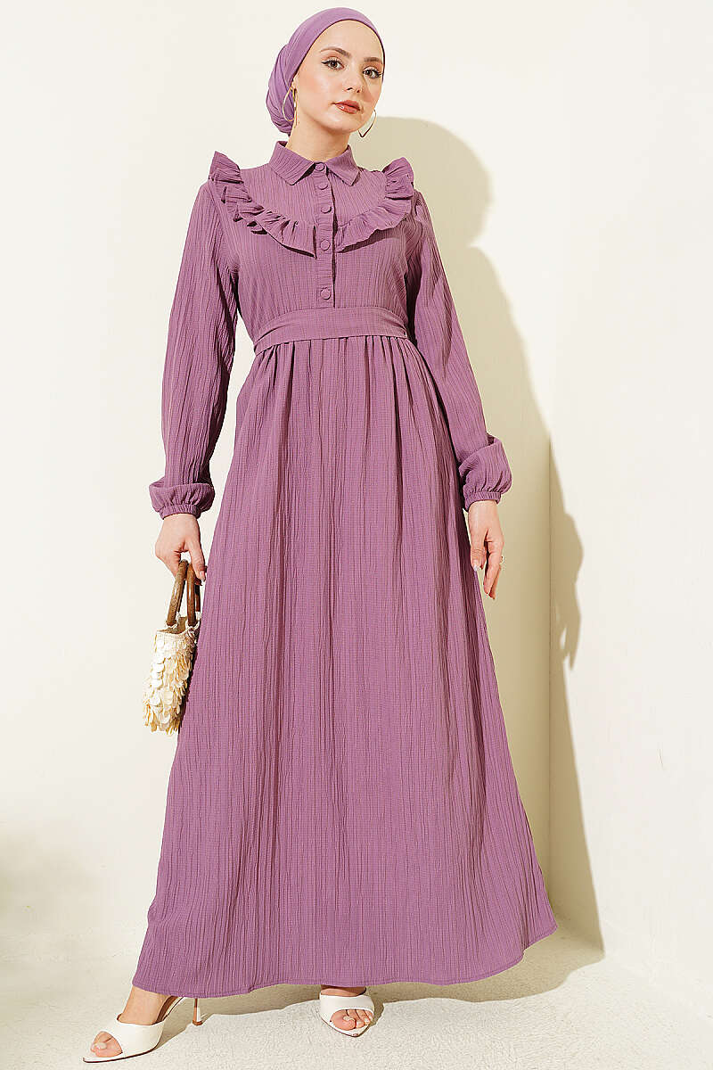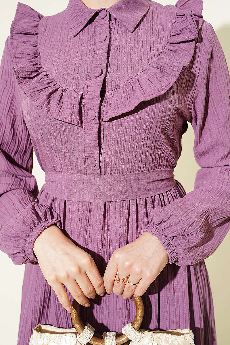 Yarım Düğmeli Fırfırlı Krinkıl Elbise Lila