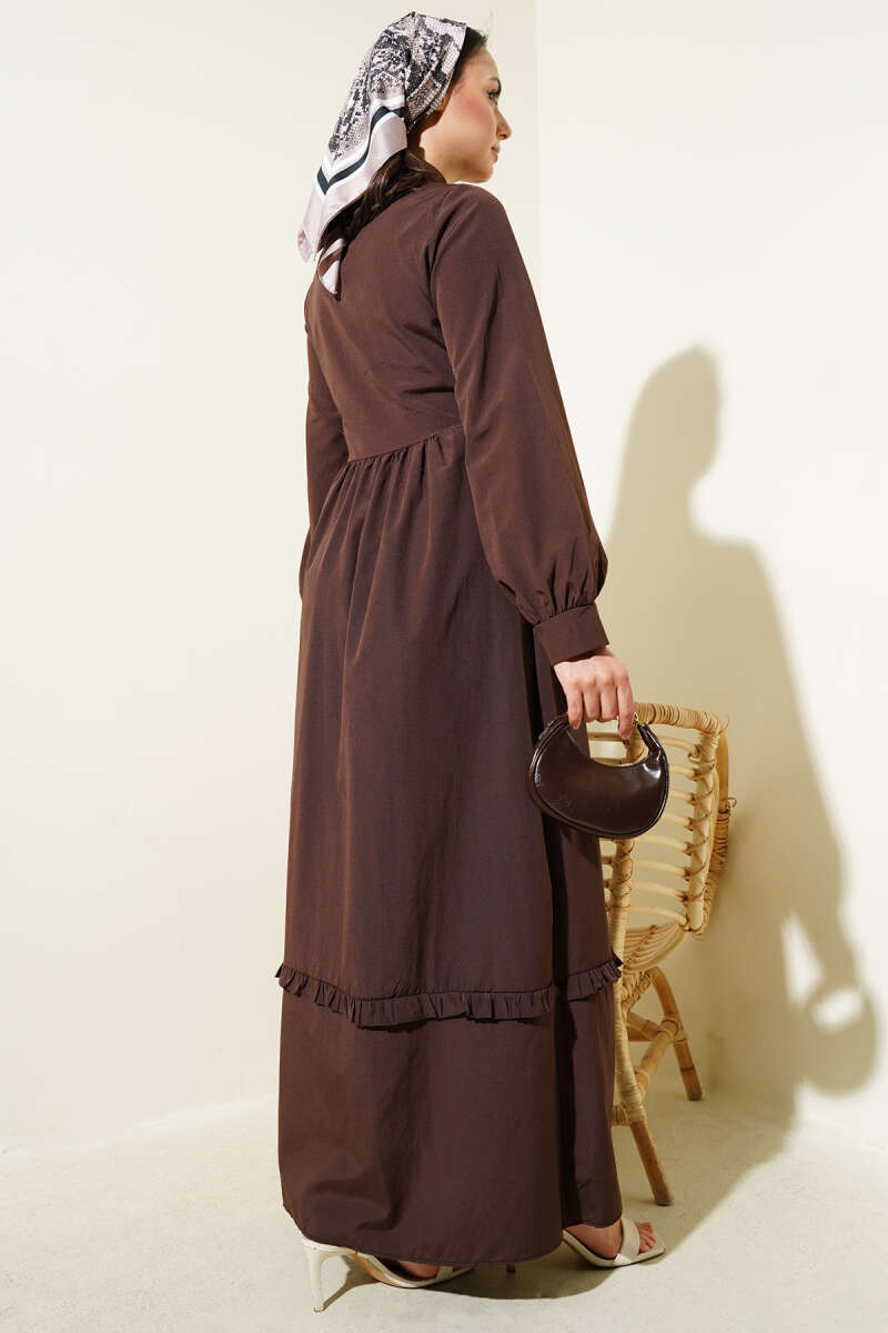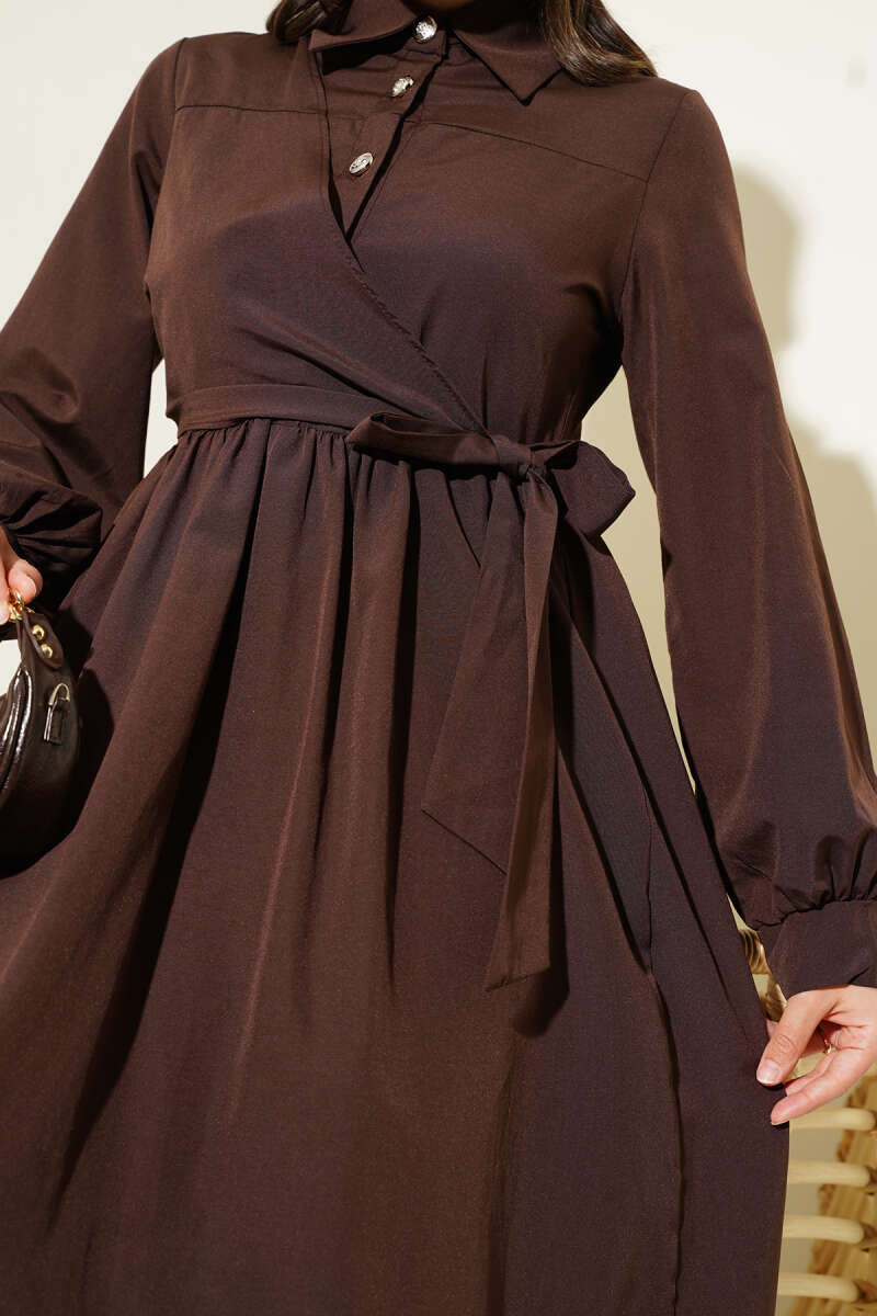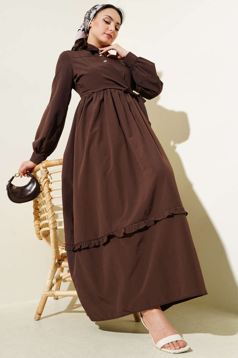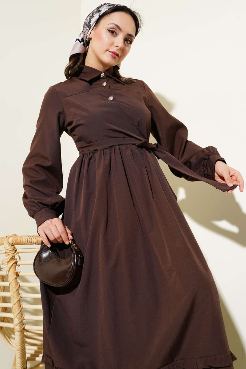 Çizgi Gömlek Garnili Triko Elbise Kahve