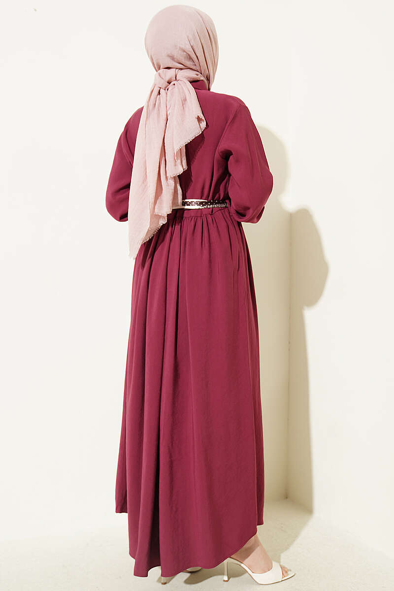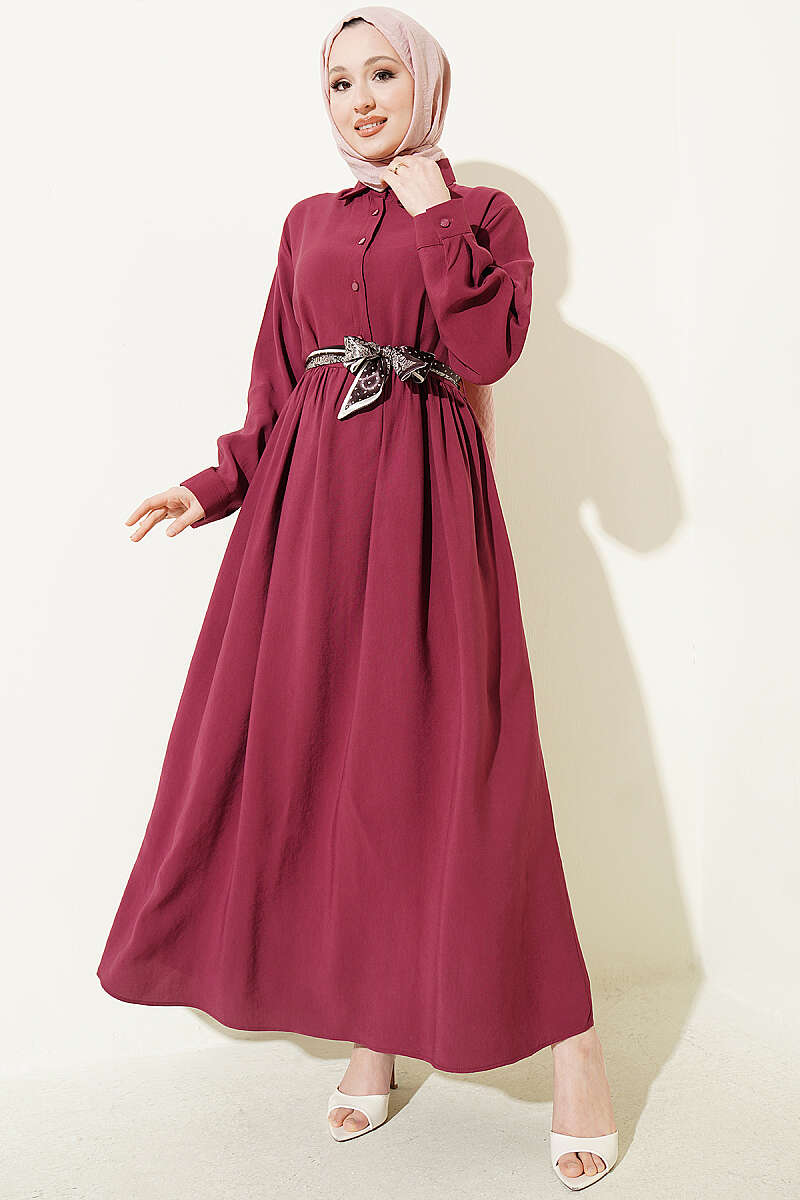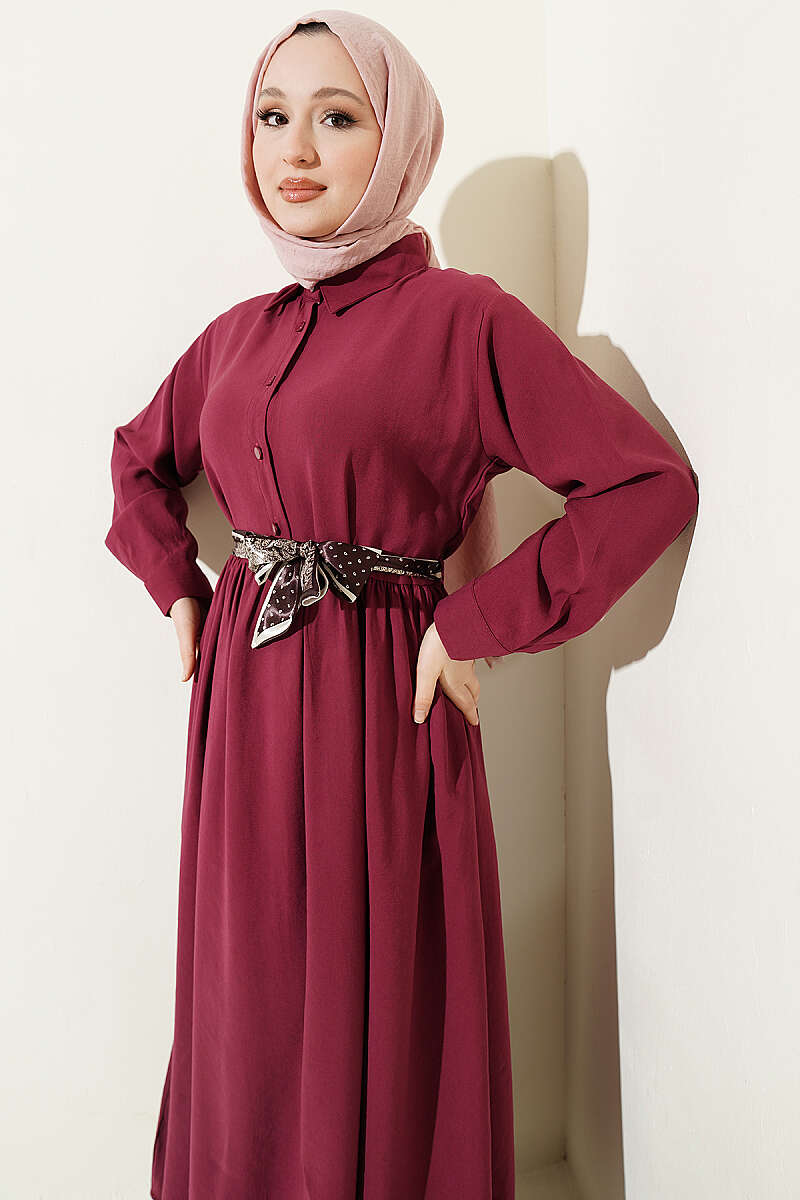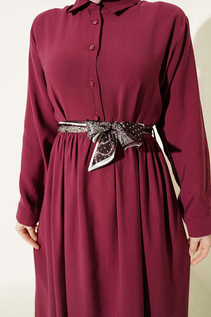 Yarım Düğmeli Fularlı Tensel Elbise Bordo