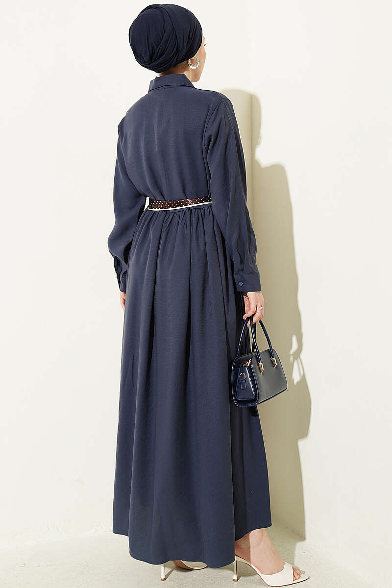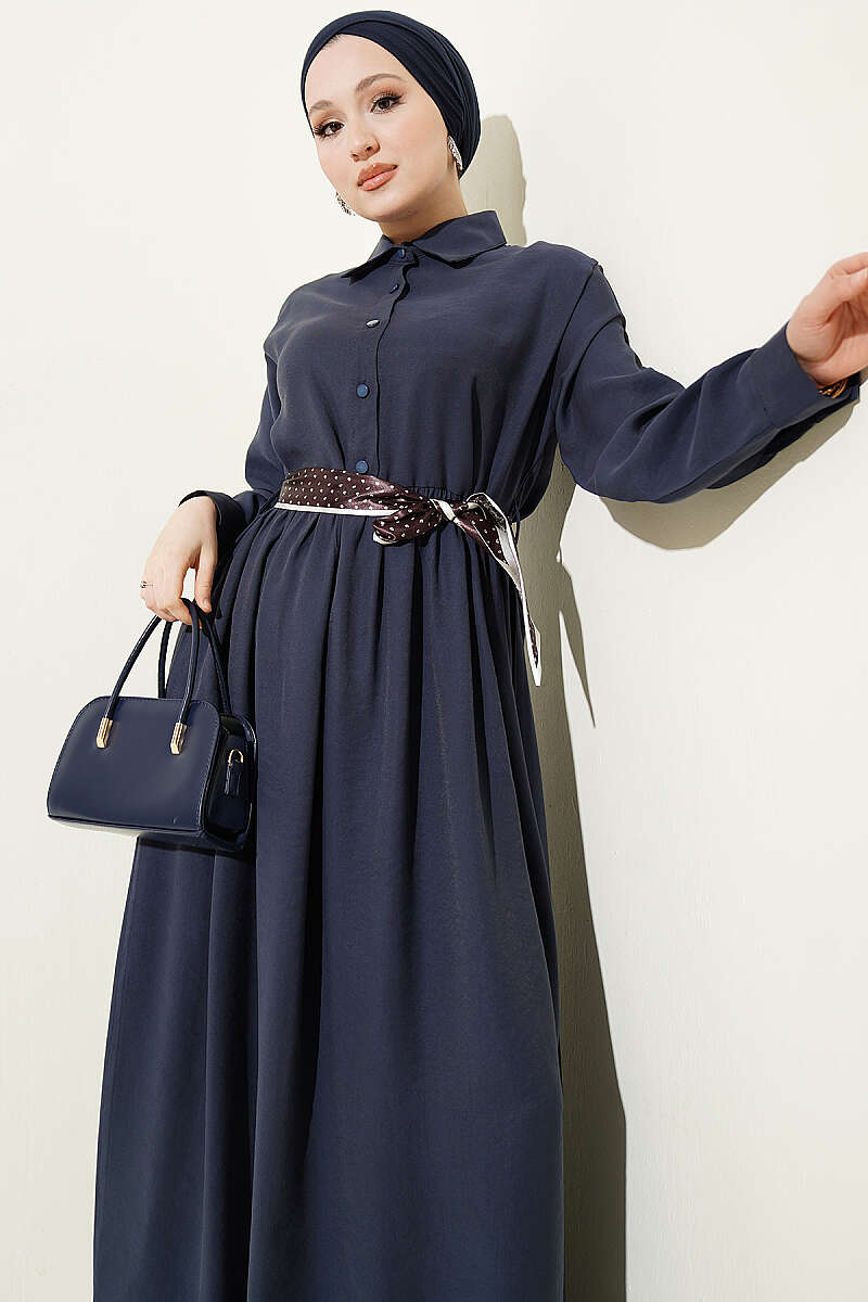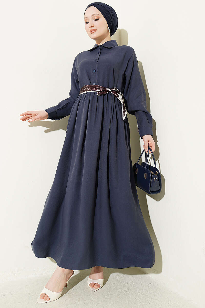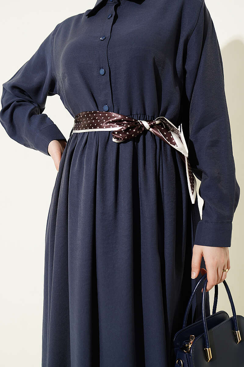 Yarım Düğmeli Fularlı Tensel Elbise Lacivert