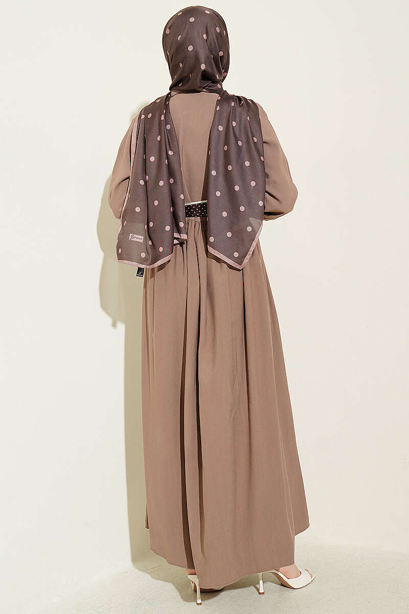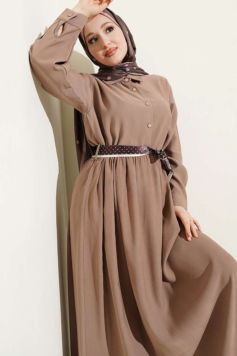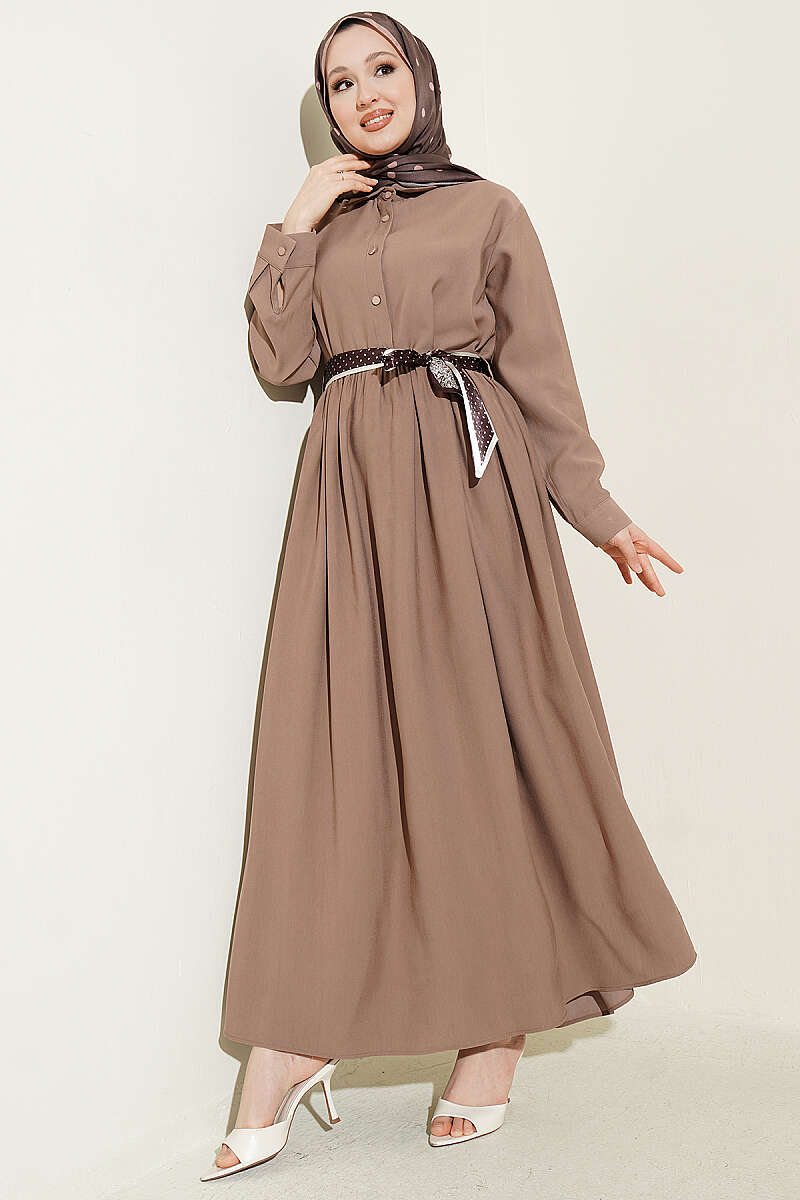 Yarım Düğmeli Fularlı Tensel Elbise Vizon