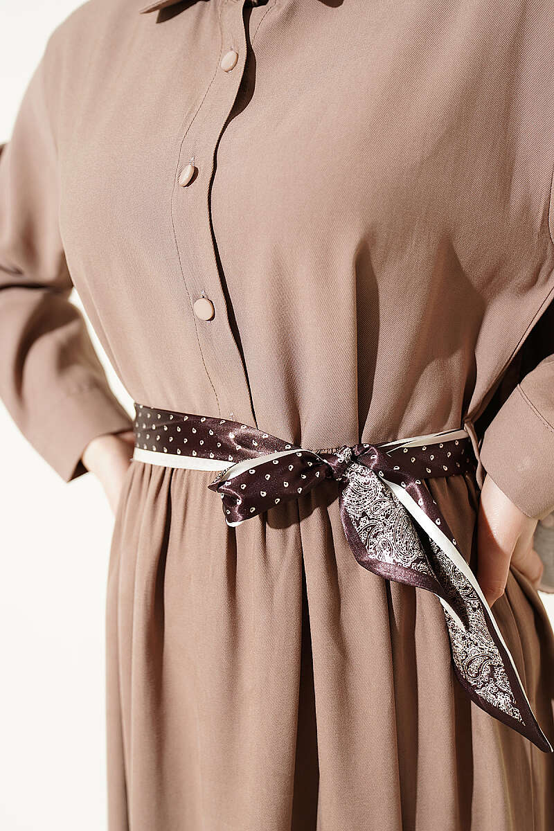 Yarım Düğmeli Fularlı Tensel Elbise Latte