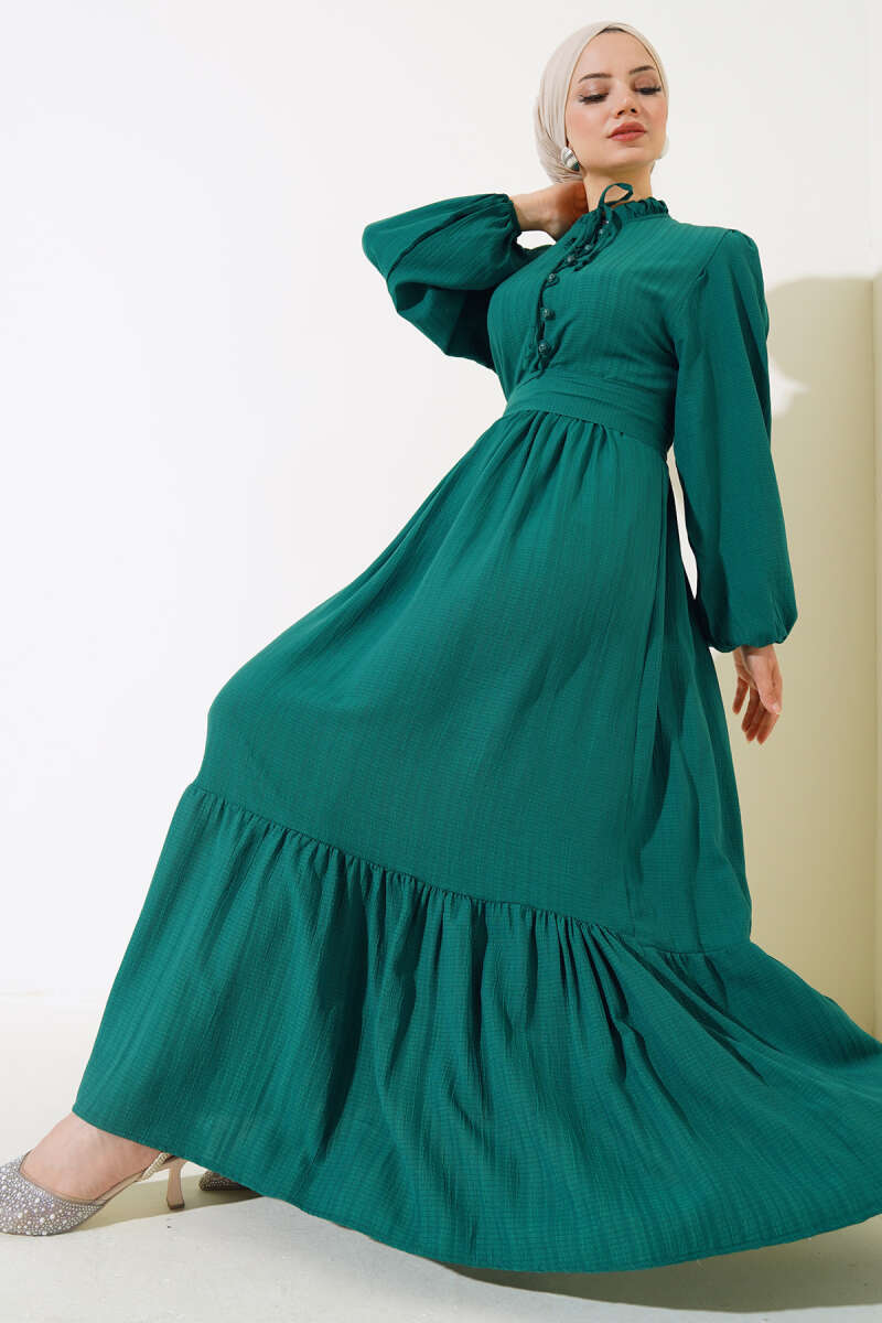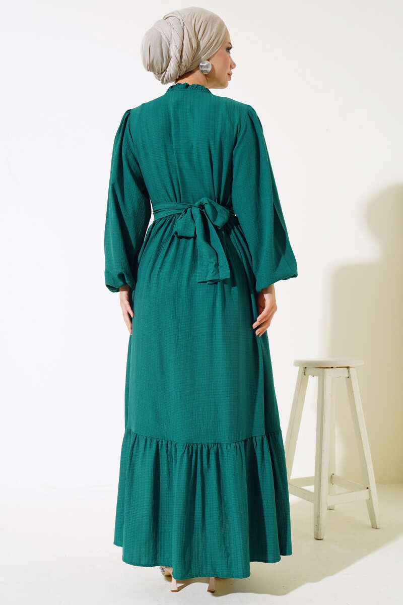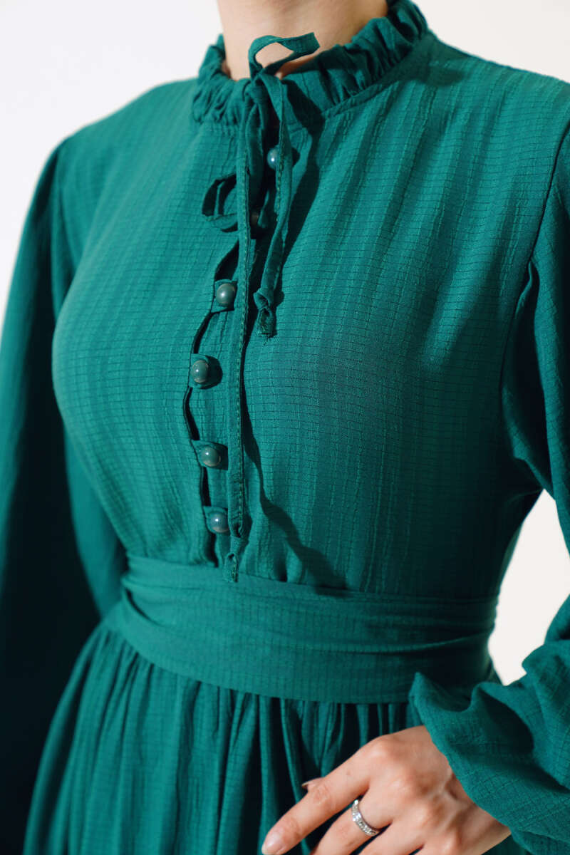 Yarım Düğmeli Kuşaklı Elbise Zümrüt