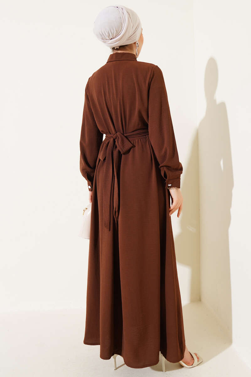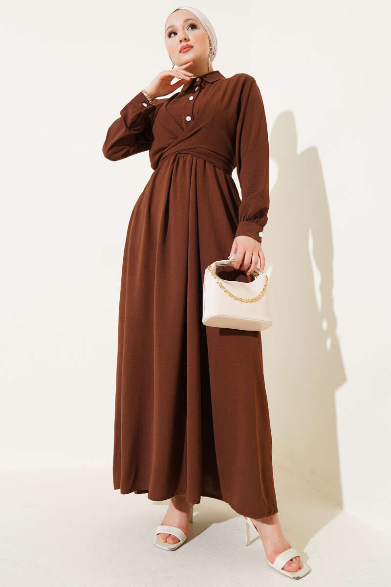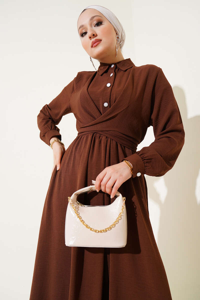 Pelerin Detaylı Pileli Triko Elbise Kahve