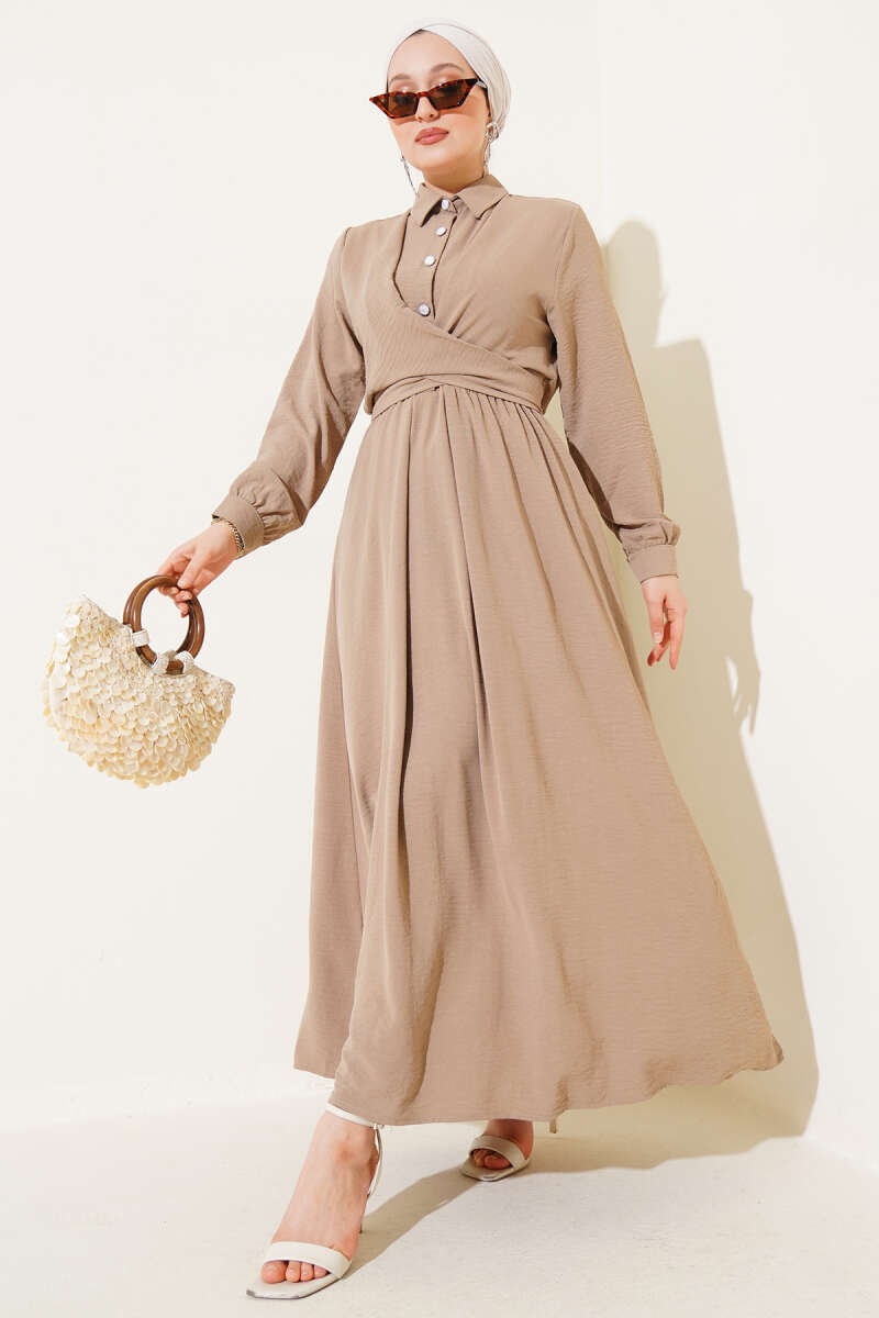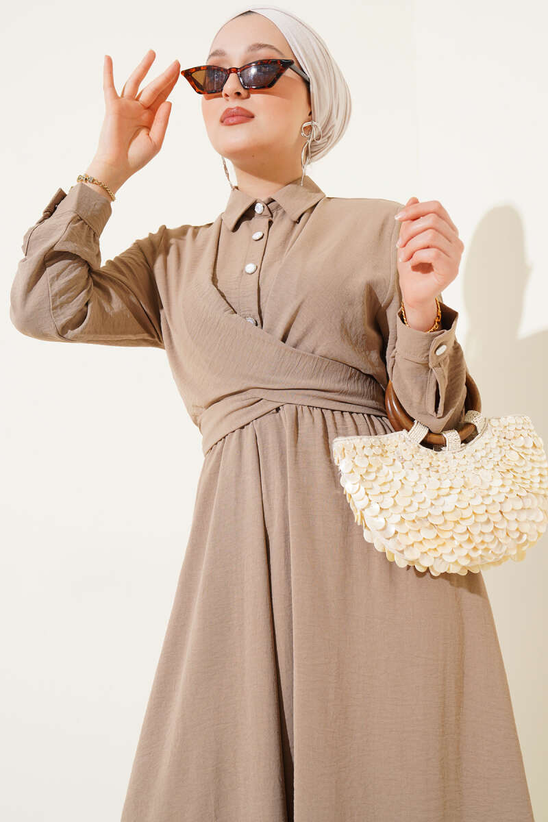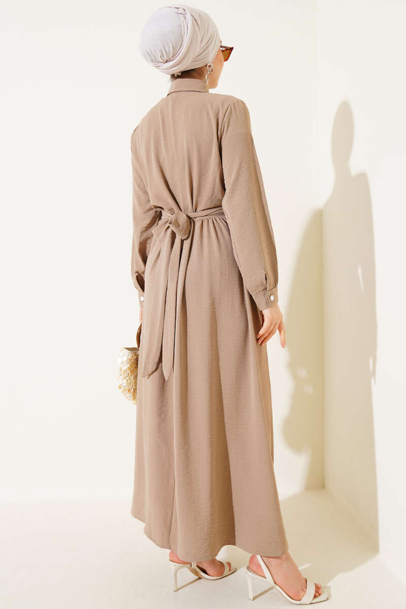 Çizgi Gömlek Garnili Triko Elbise Kahve Bej