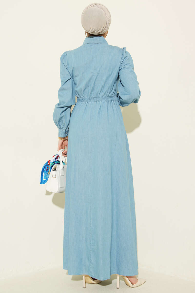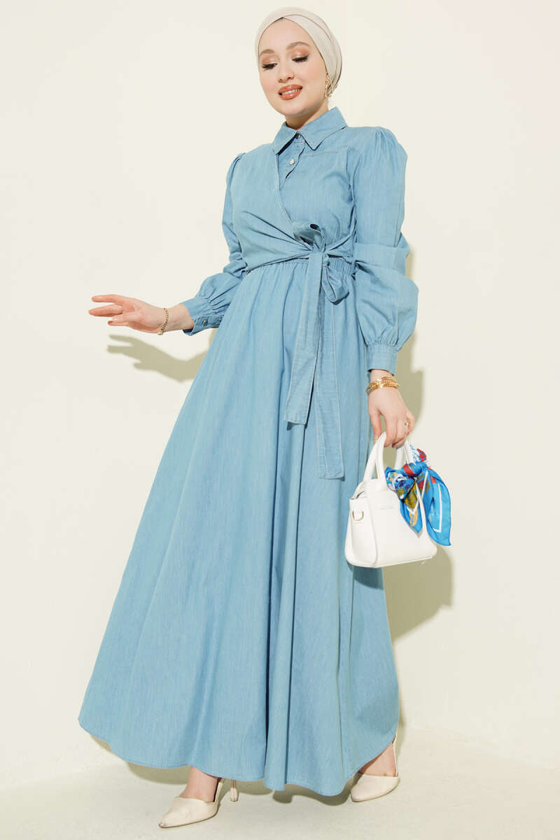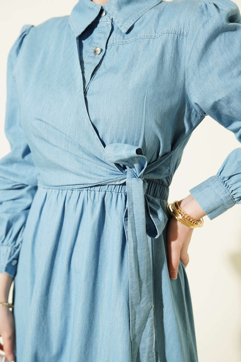 Yarım Düğmeli Yan Bağlamalı Kot Elbise Açık Mavi