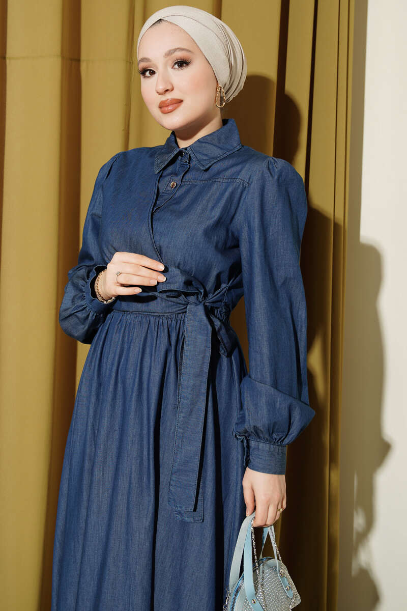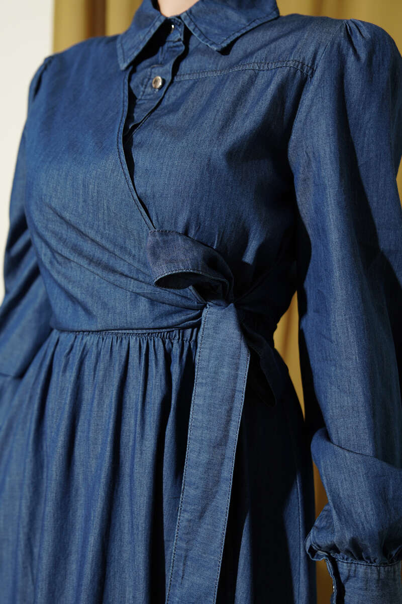 Yarım Düğmeli Yan Bağlamalı Kot Elbise Mavi