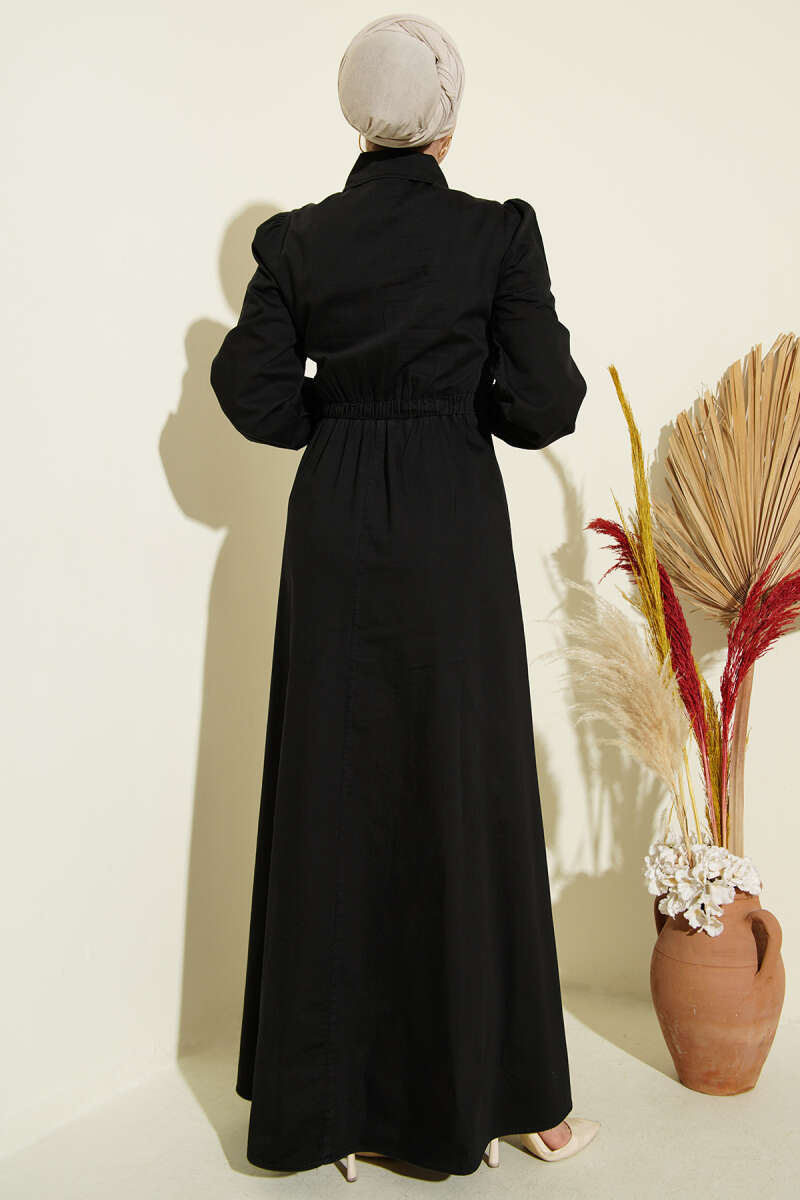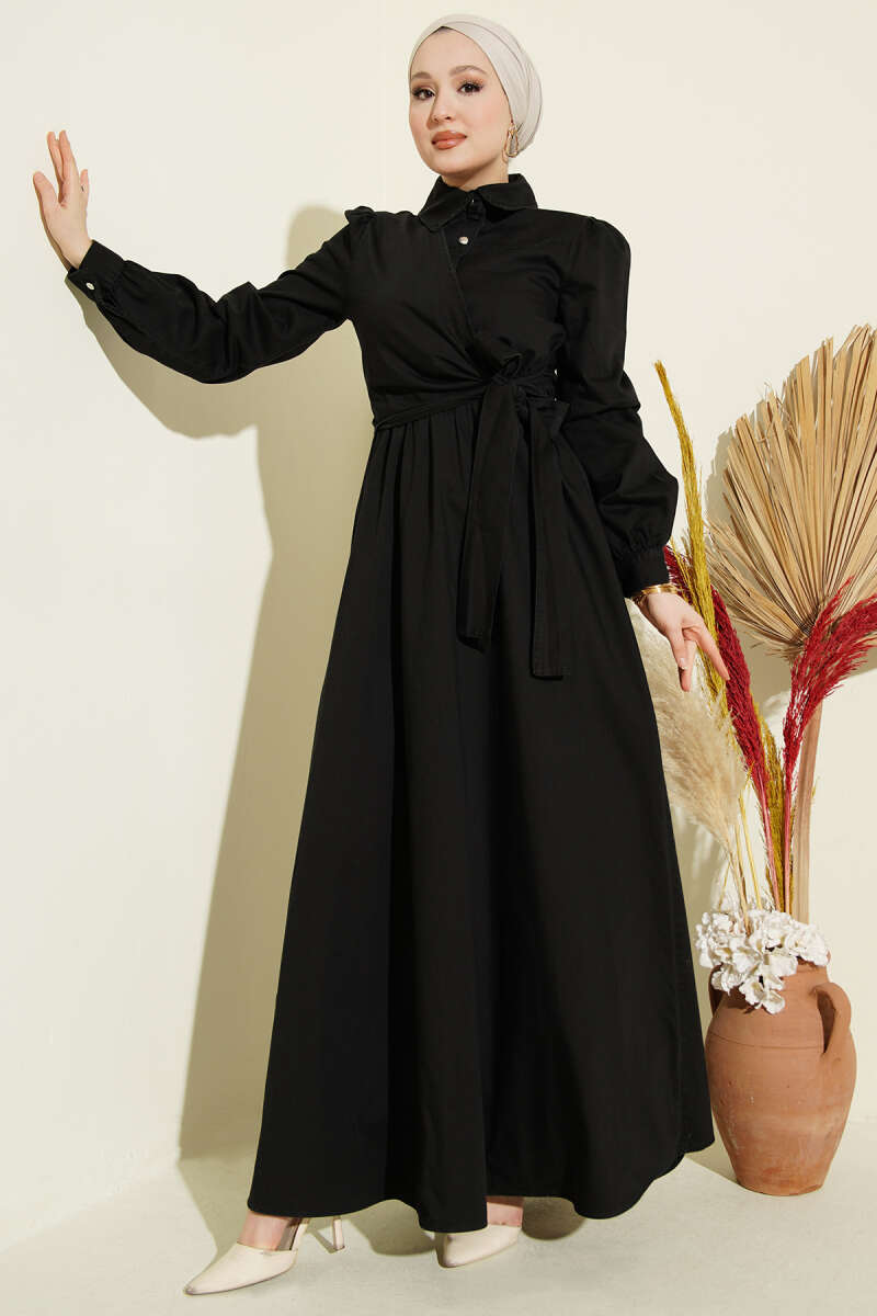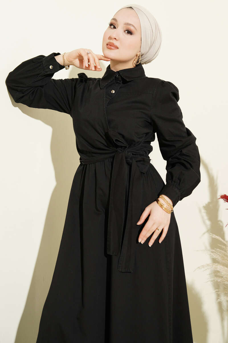 Yarım Düğmeli Yan Bağlamalı Kot Elbise Siyah
