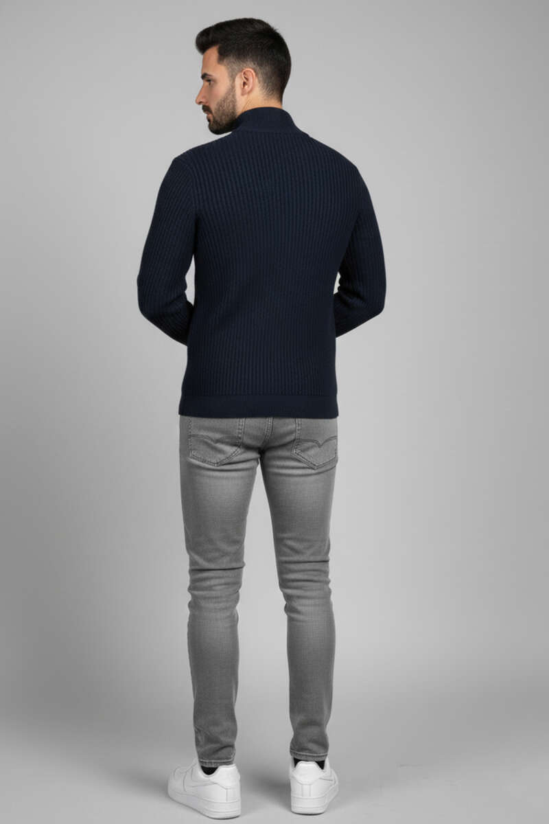 Çizgili Yarım Fermuar Erkek Triko Kazak İndigo