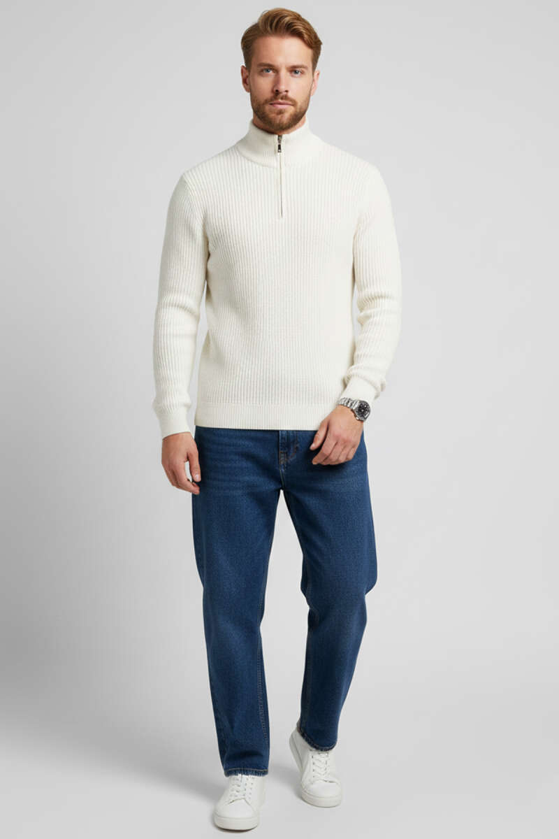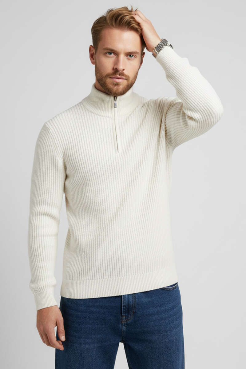 Yarım Fermuar Boğazlı Kazak Ekru