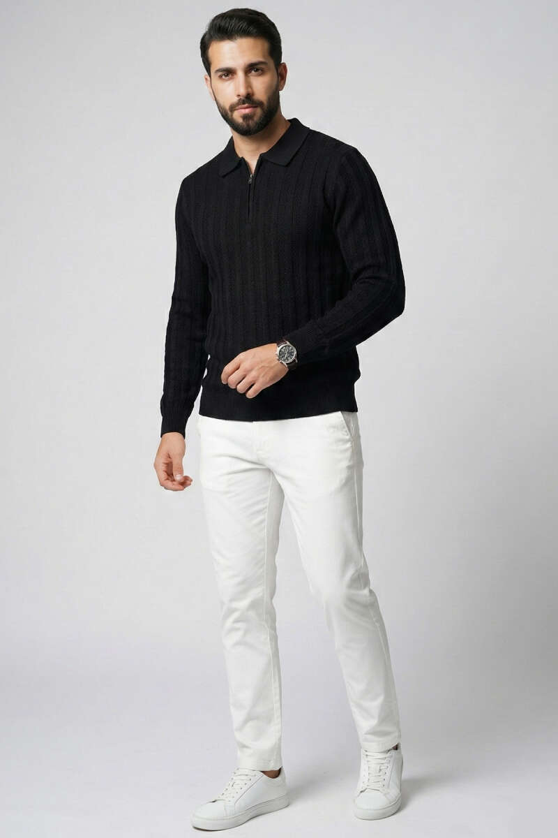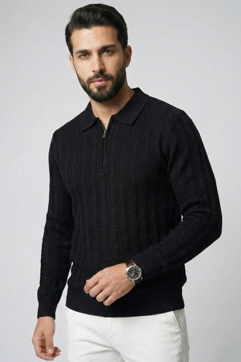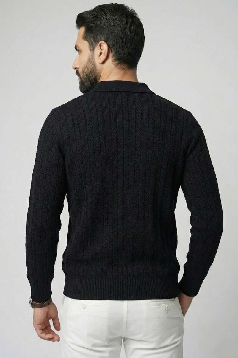 Waffle Kumaş Balıkçı Yaka Erkek Kazak Siyah