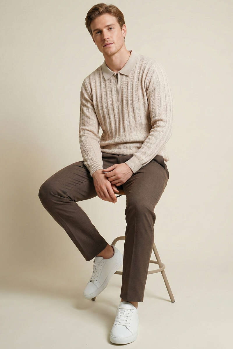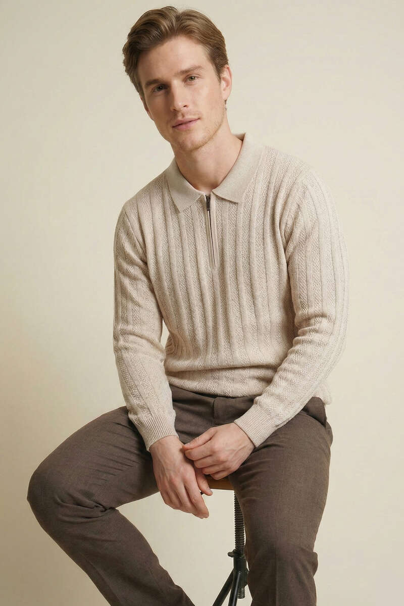 Yarım Fermuar Boğazlı Kazak Ekru