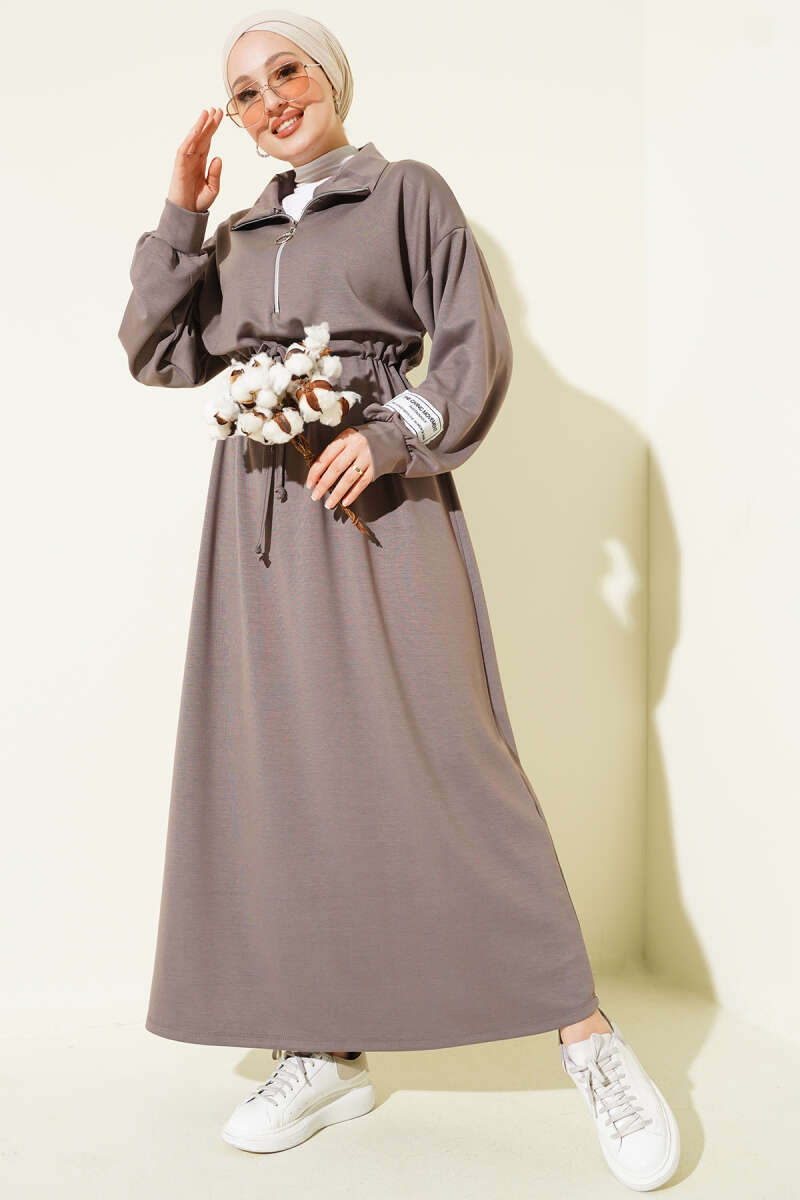 Yarım Fermuarlı Armalı Loyşa Elbise Kahve